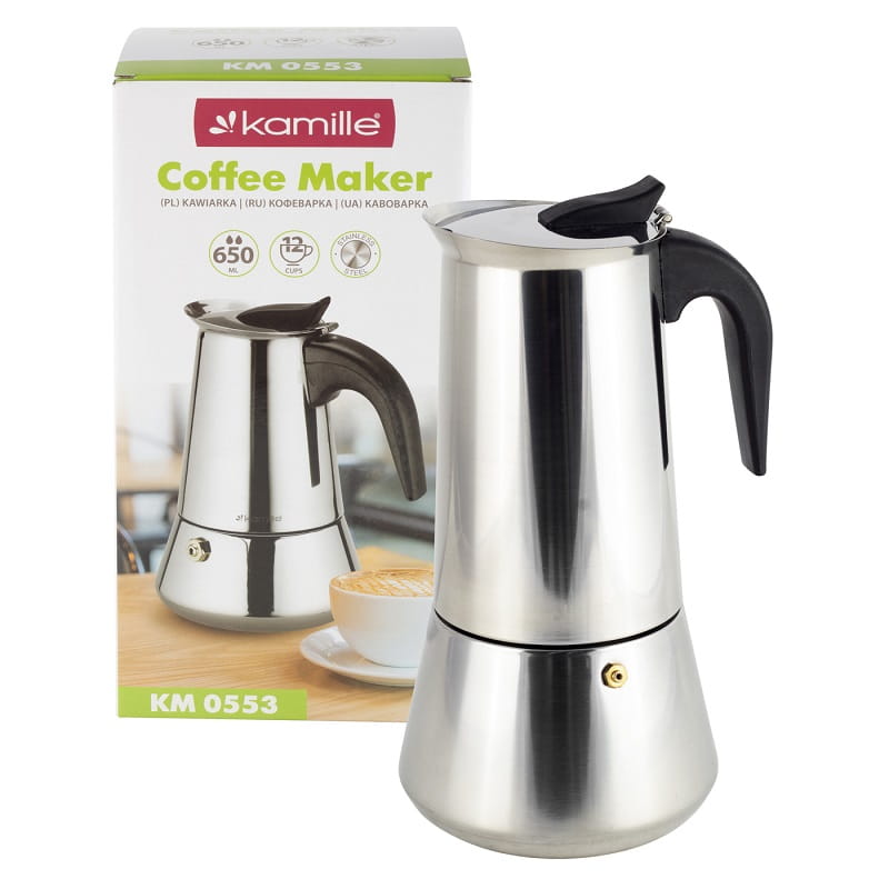 Elegancka i funkcjonalna kawiarka jest urządzeniem, dzięki któremu można bardzo szybko i łatwo zaparzyć esencjonalne i aromatyczne espresso. Makinetka wykonana z wysokiej jakości stali nierdzewnej. Ma unikalną jednobryłową konstrukcję, która podoba się większości kawoszom. Jeśli wybierzesz, to obiecujemy, że kawiarka ta będzie nieodzownym towarzyszem wszystkich Twoich śniadań.Moka została wyposażona w zaworek ciśnieniowy w celu odprowadzania nadmiaru pary wodnej, co zapewnienia długą bezawaryjną eksploatację. Produkt o pojemności 650 ml pozwala na przygotowanie 12 filiżanek kawy. Posiada funkcjonalny bakelitowy uchwyt, który stabilnie będzie się trzymać w dłoni.