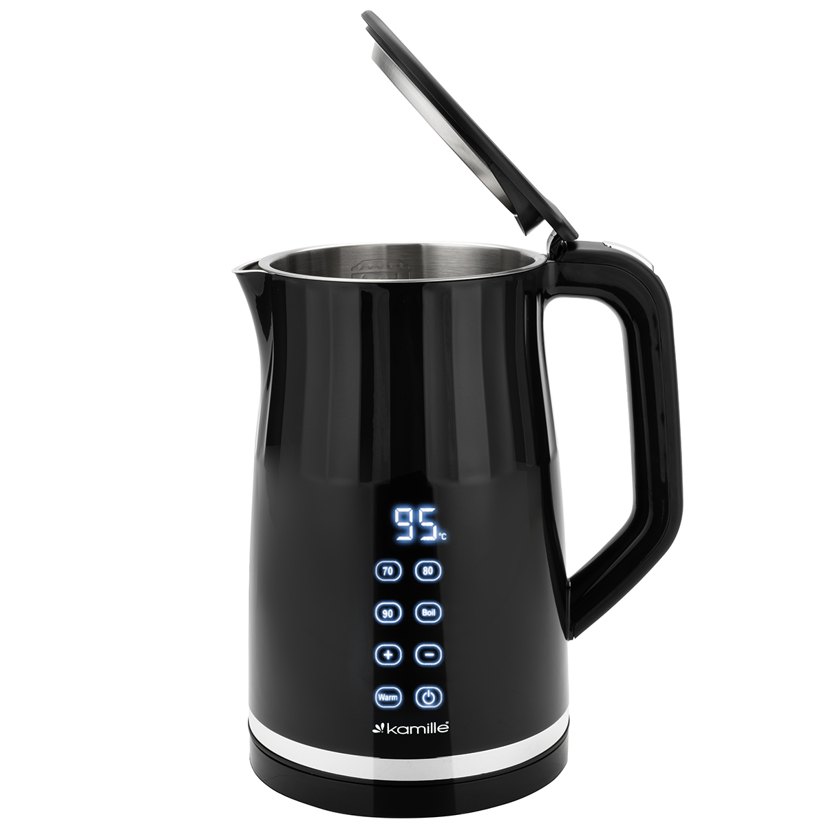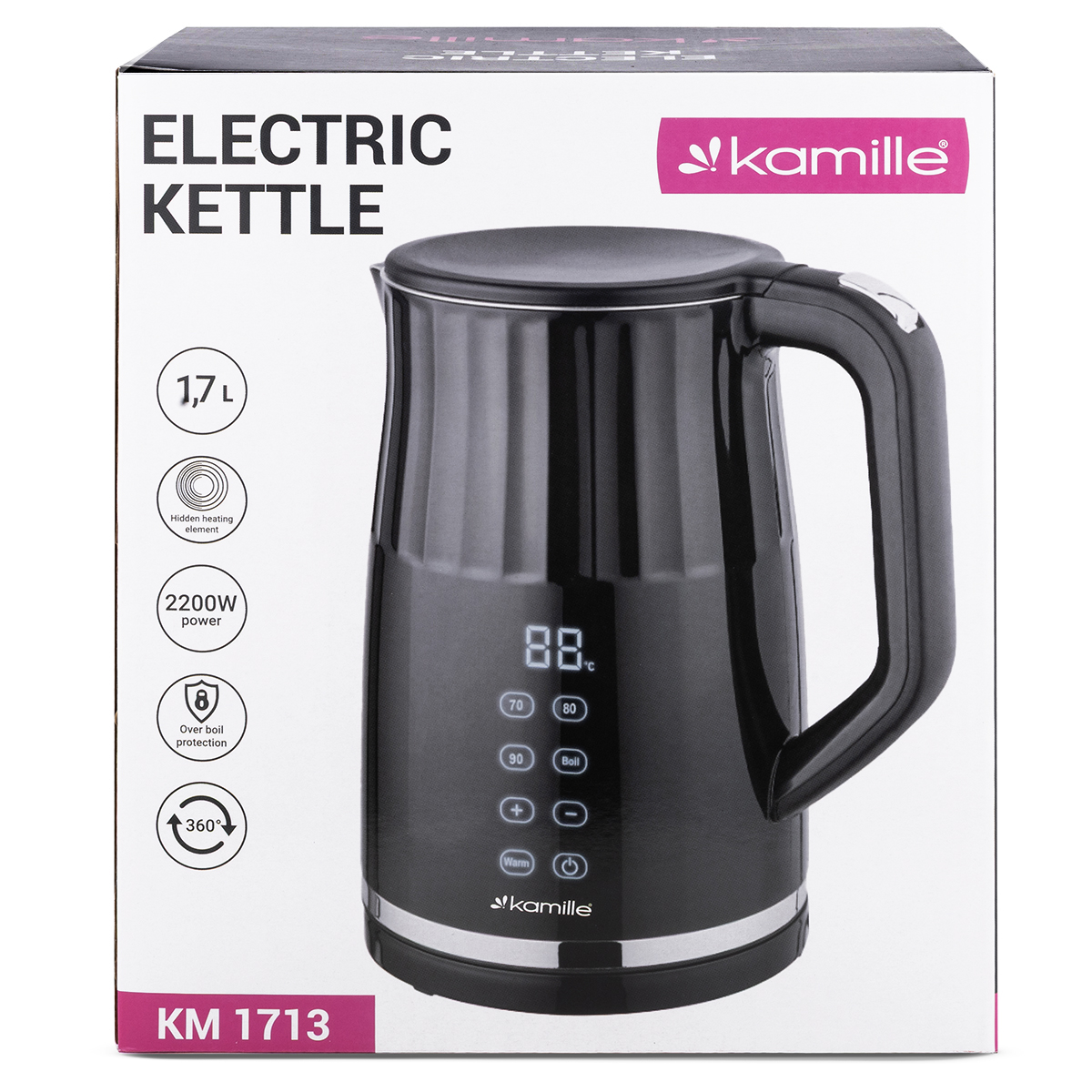 Czajnik został wyposażony w jednolite wnętrze wykonane w całości ze stali nierdzewnej, co gwarantuje maksymalną trwałość, bezpieczeństwo i łatwość utrzymania czystości. Czajnik elektryczny Kamille wyposażony jest w praktyczną podstawę obrotową 360°, która umożliwia odstawienie go z dowolnej strony. Dzięki temu korzystanie z urządzenia jest wygodne zarówno dla osób prawo-, jak i leworęcznych. Odkryj nowy poziom komfortu i bezpieczeństwa dzięki czajnikowi elektrycznemu wyposażonemu w innowacyjną technologię CoolTouch. Dzięki specjalnej konstrukcji dolna obudowa czajnika nie nagrzewa się, co chroni przed poparzeniem i pozwala bezpiecznie korzystać z urządzenia nawet w obecności dzieci.