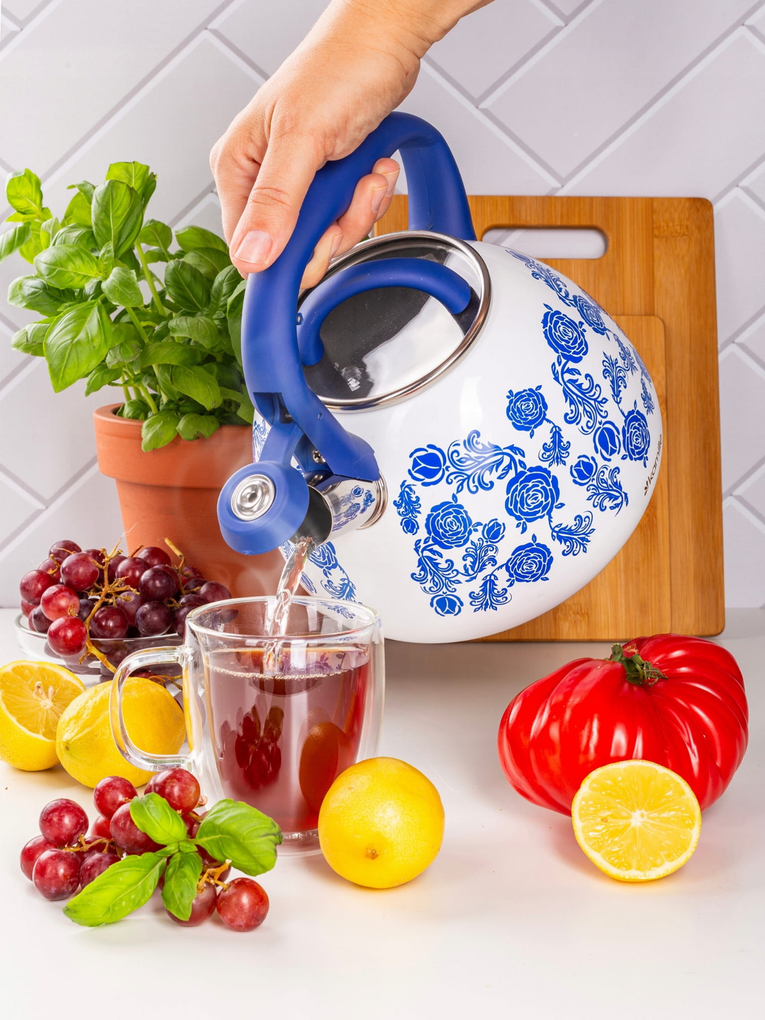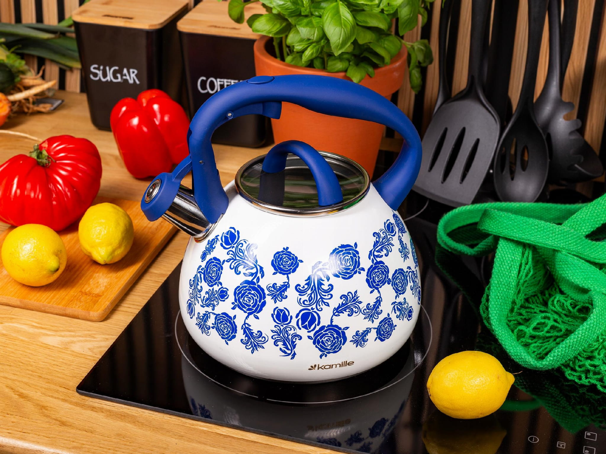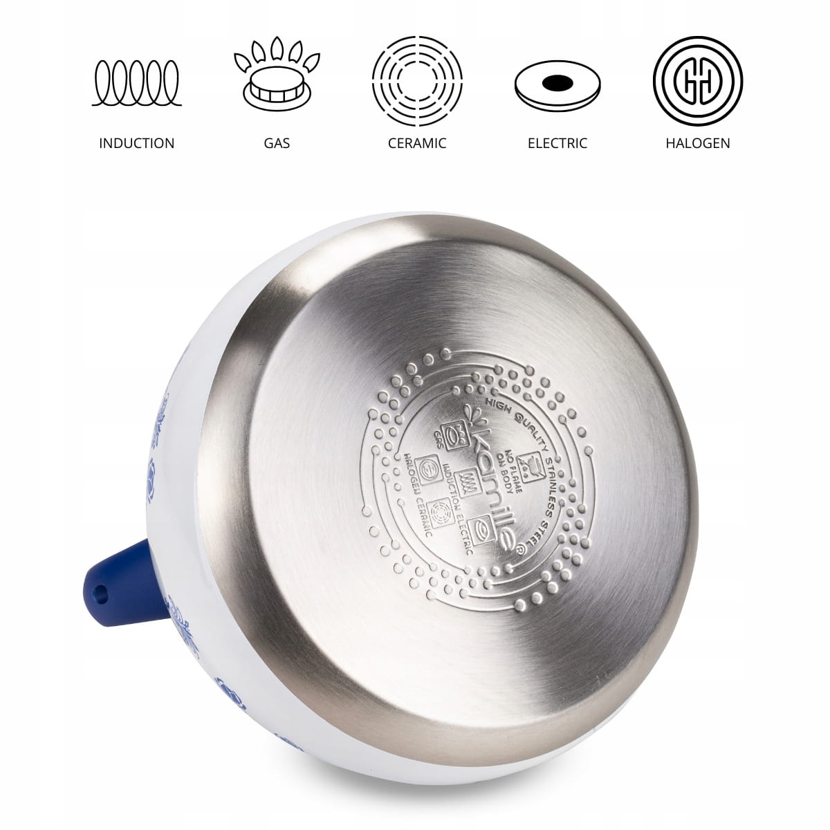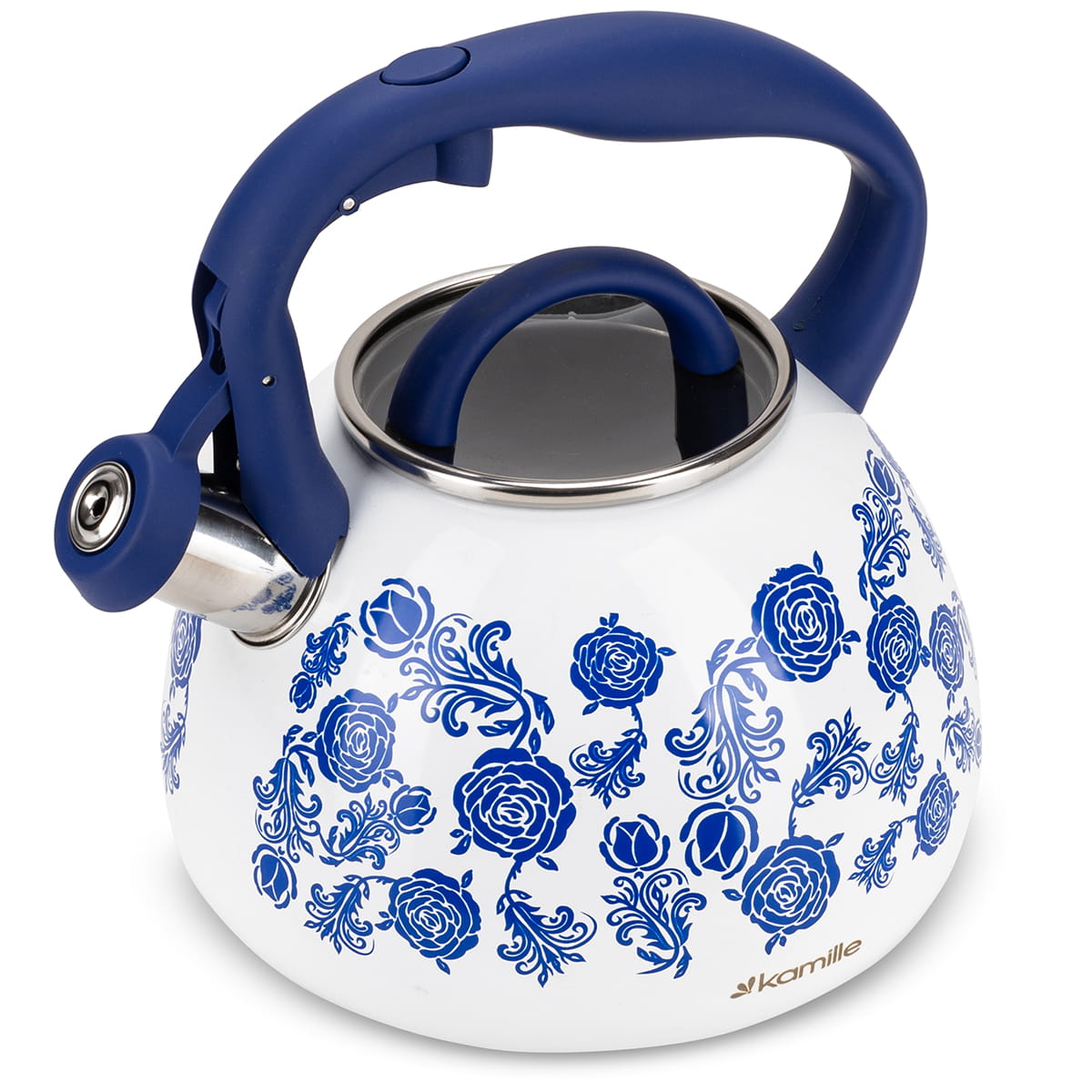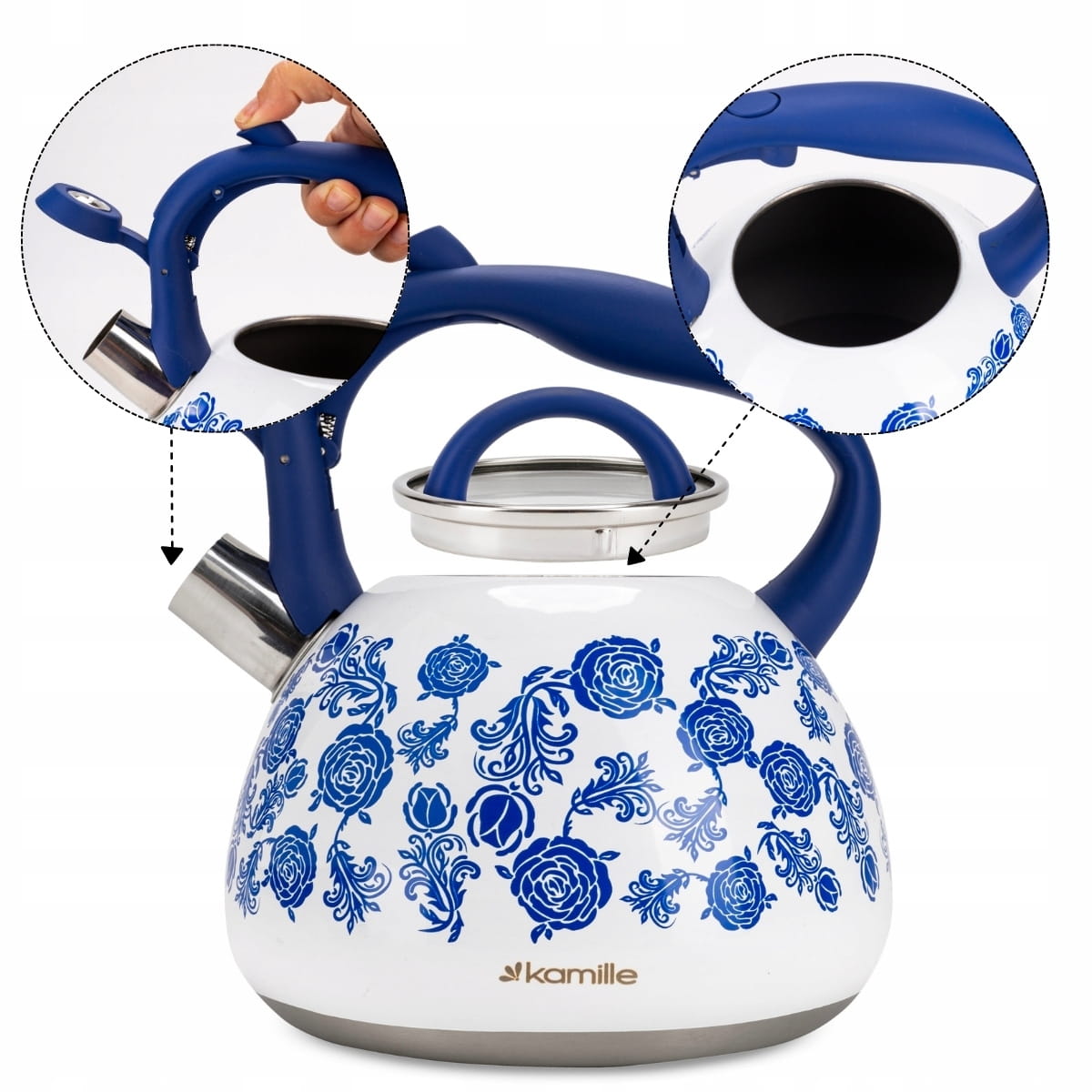 Elegancki i funkcjonalny czajnik Kamille z najnowszej linii wzorniczej wykonany z materiałów najwyższej jakości. Zrobiony ze stali nierdzewnej z wbudowanym na stałe gwizdkiem. Posiada funkcjonalny i nienagrzewający się uchwyt, który stabilnie będzie się trzymać w dłoni. Czajnik ma wbudowany przycisk do uchylania gwizdka. Dzięki kapsule podwójnego dna równomiernie rozprowadza i utrzymuje na dłużej ciepło, zaś gwizdek poinformuje o zagotowaniu wody, tym samym oszczędza energię.