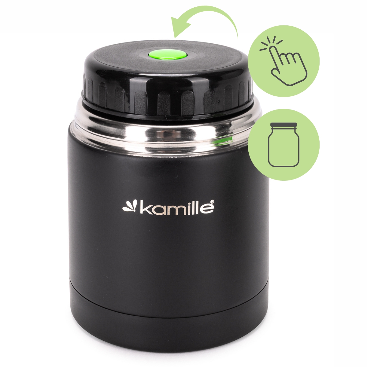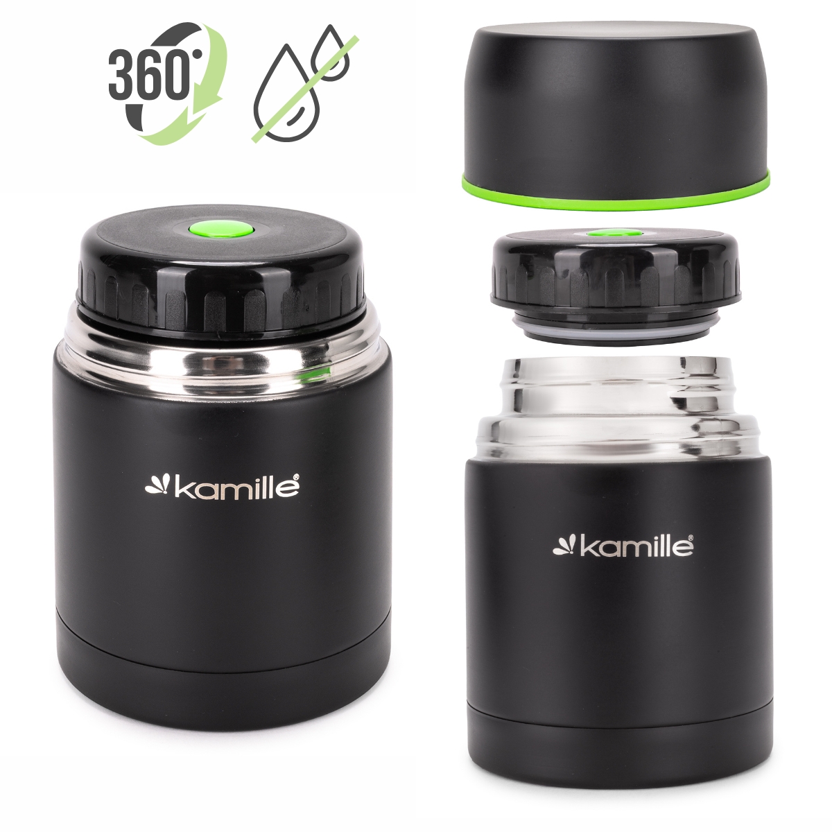 Dobre właściwości termiczne termosu na żywność Kamille wynikają z zastosowania podwójnych ścianek gwarantujących skuteczną izolację. W zakrętce wewnętrznej znajduje się dodatkowa silikonowa uszczelka dzięki której termos w 100% zachowuje szczelność. Zakrętka zewnętrzna została estetycznie wykończona tworzywem, które pozwala wykorzystywać ją jako miseczkę.