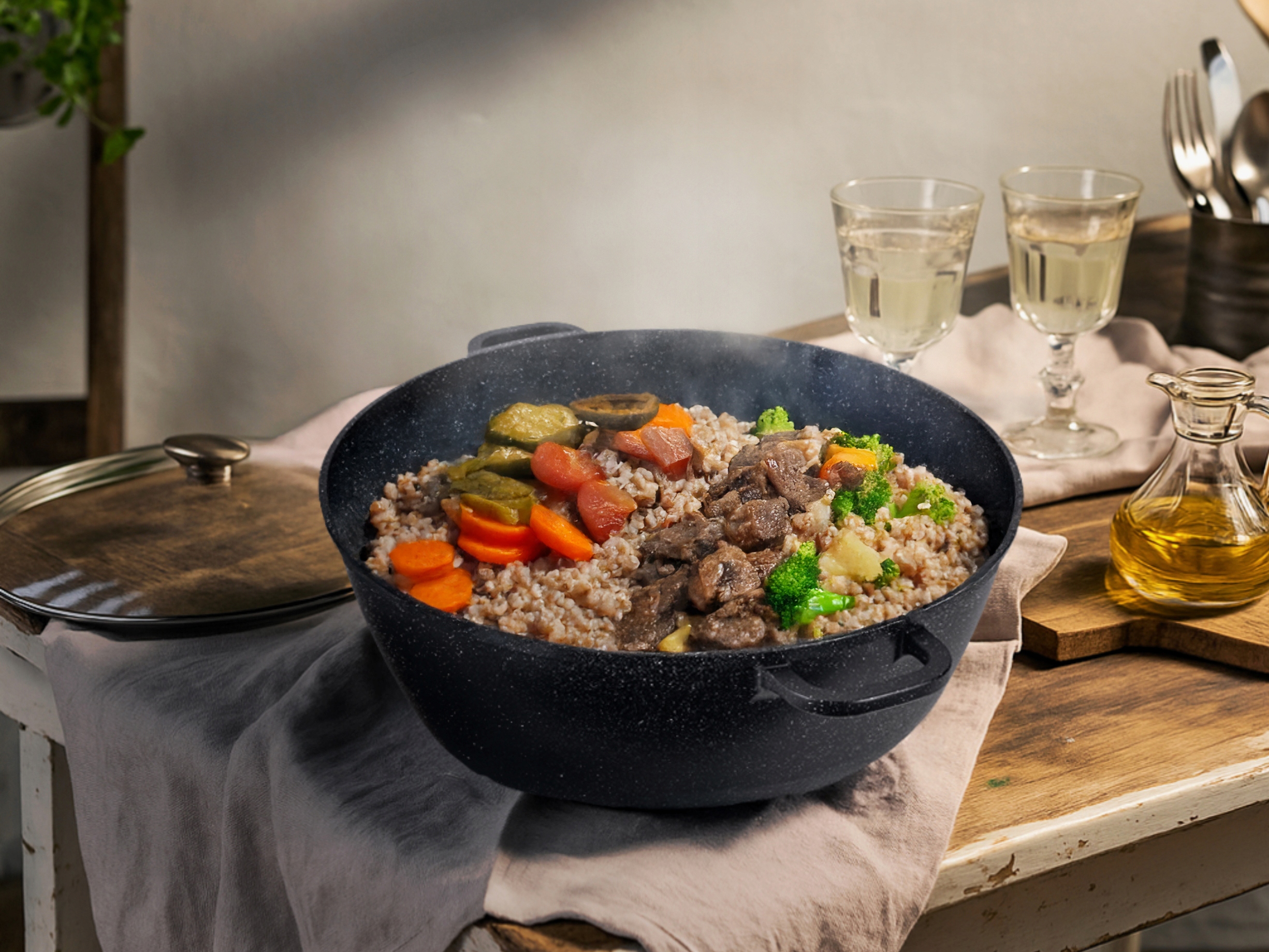 1. Nieprzywierająca powłoka marmurowa – górna warstwa naczynia pokryta jest trwałą powłoką o efekcie marmuru, która zapobiega przywieraniu potraw, umożliwia smażenie bez tłuszczu i jest niezwykle łatwa w czyszczeniu.