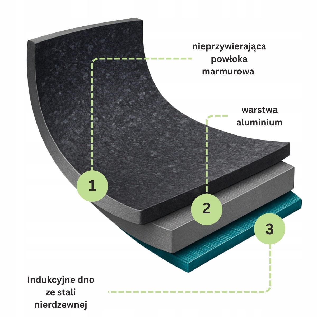 specjalna powłoka MARMUROWA, która posiada właściwości antyadhezyjne, - zapobiega przywieraniu, jest odporna na zarysowania i wysokie temperatury