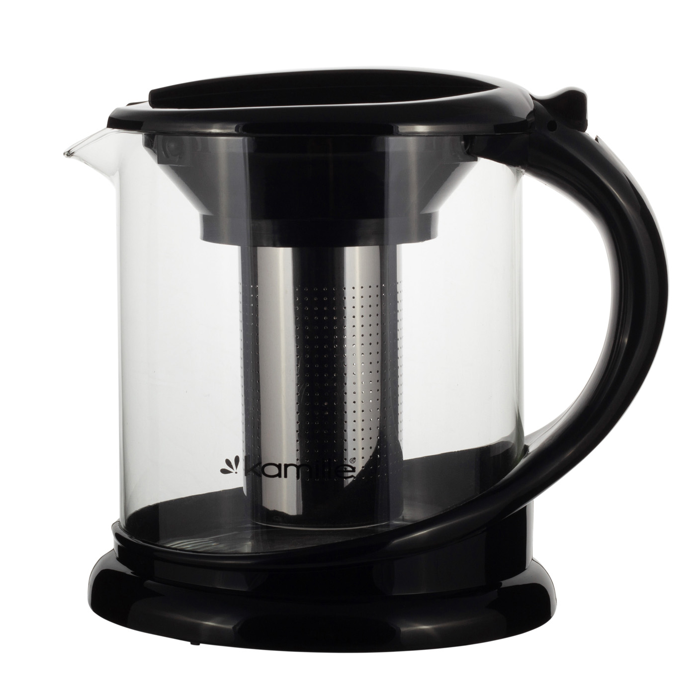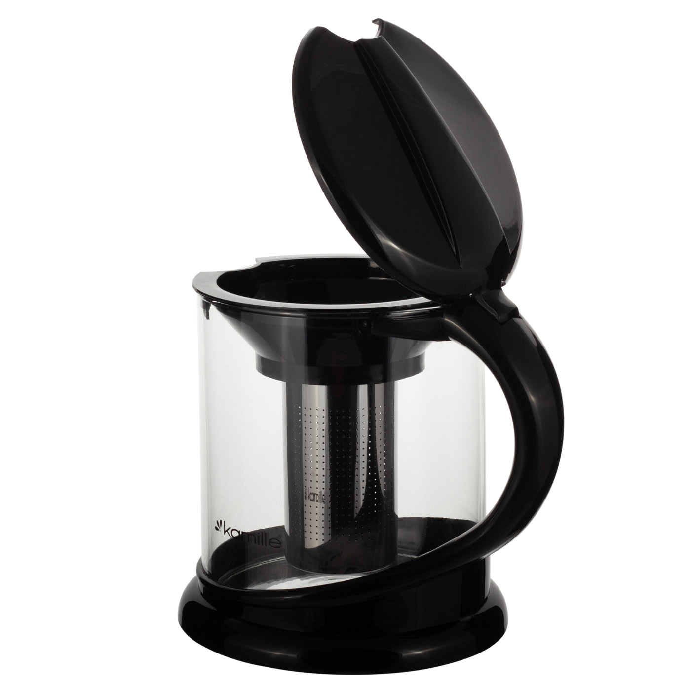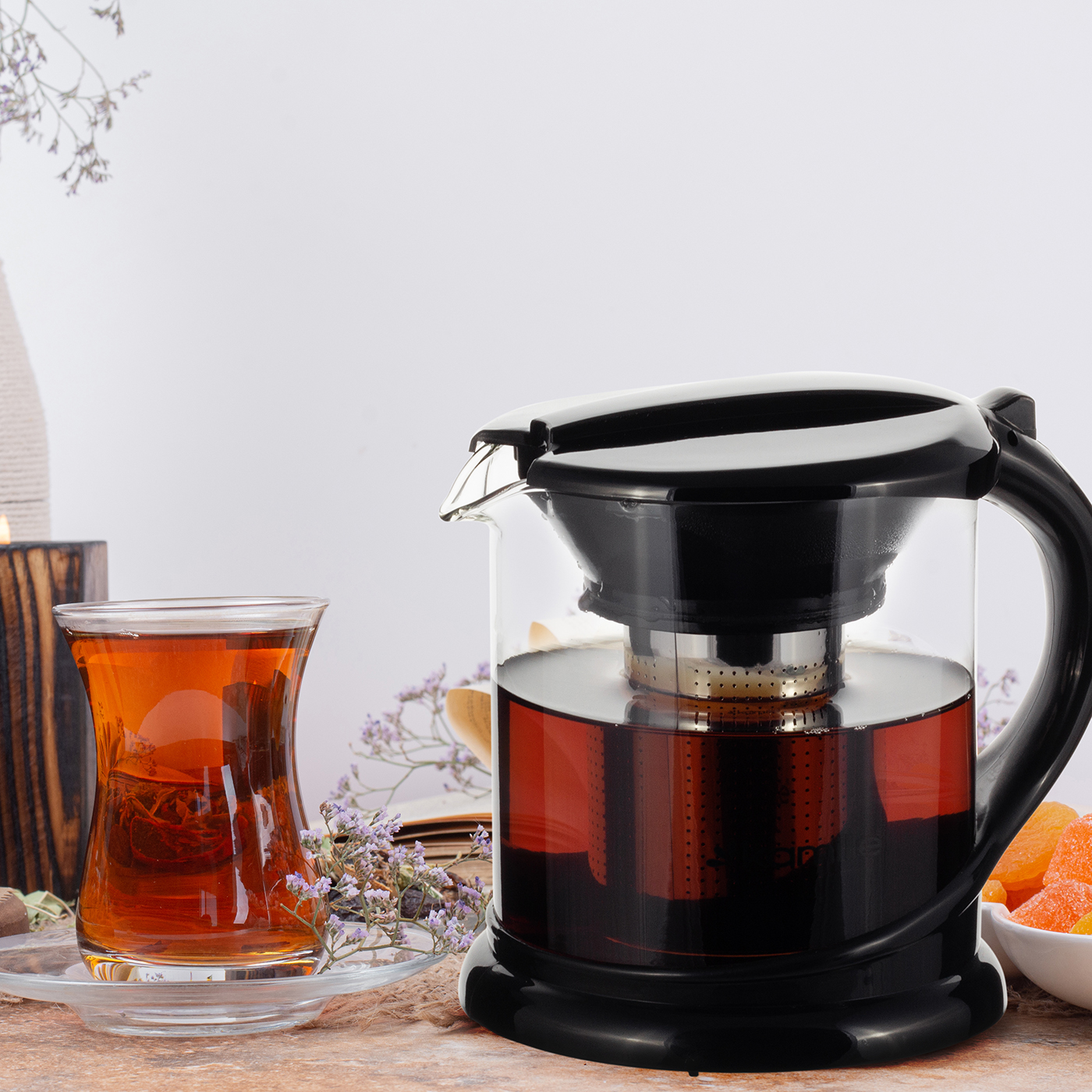 Zaparzacz do herbaty wykonany z wysokiej jakości tworzywa sztucznego oraz żaroodpornego i trwałego szkła. Dzbanek posiada stalowe sitko, które umożliwia przygotowanie herbat oraz naparów o intensywnym smaku i aromacie już w kilka minut. Kształt dzióbka sprawia że z łatwością przelejemy gorący napój do kubków. Może być używany do herbat liściastych, ziołowych, owocowych a bez zaparzacza do napojów zimnych. Wyposażony w wygodny uchwyt, który stabilnie będzie się trzymać w dłoni. Pokrywka ułatwiająca otwieranie chroni przed poparzeniem.