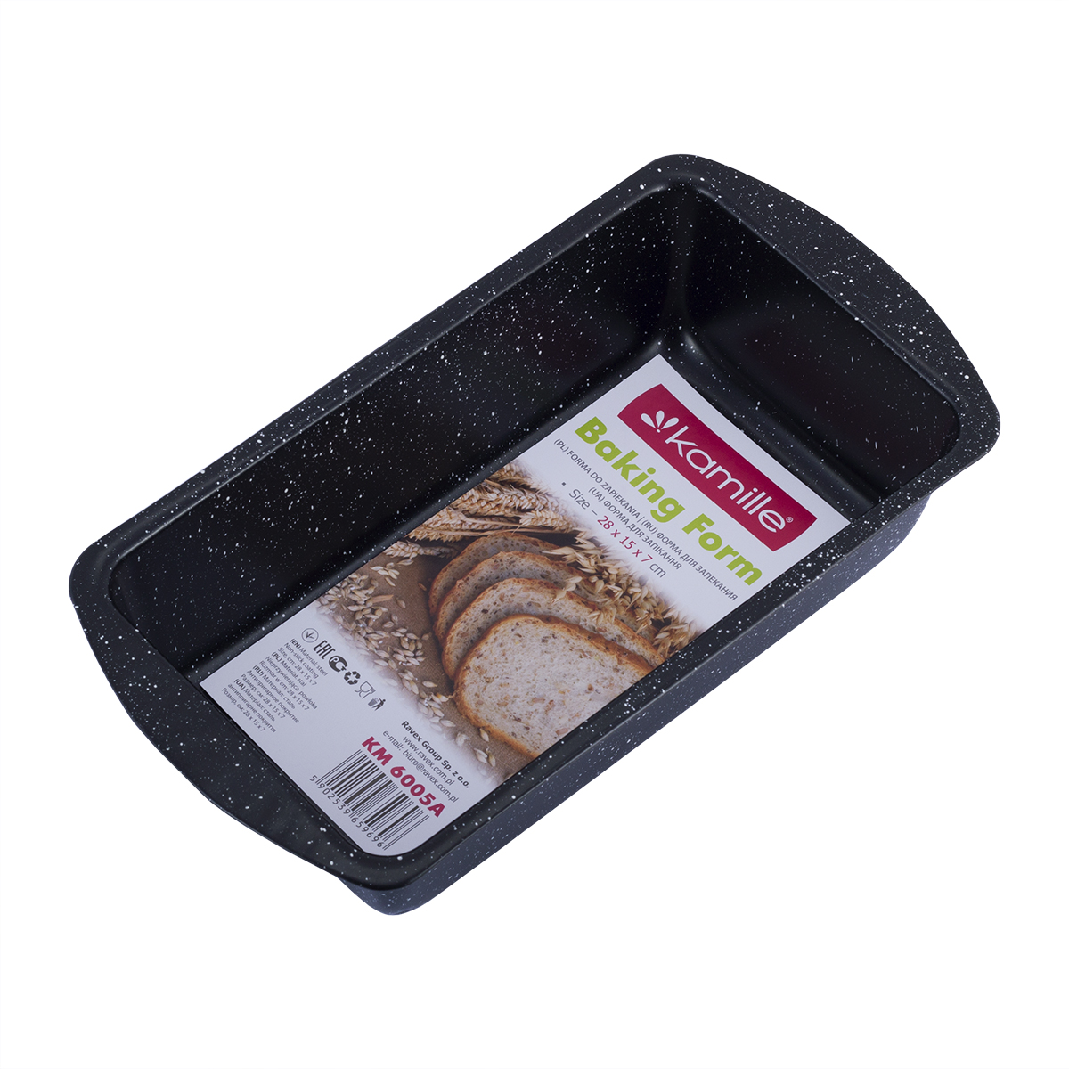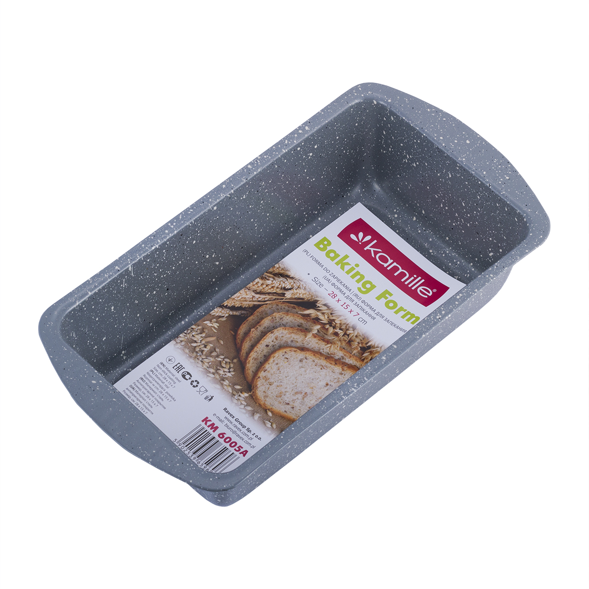 Wymiary formy: 28 × 15 × 7 cm – klasyczny rozmiar do pieczenia chleba i ciast.