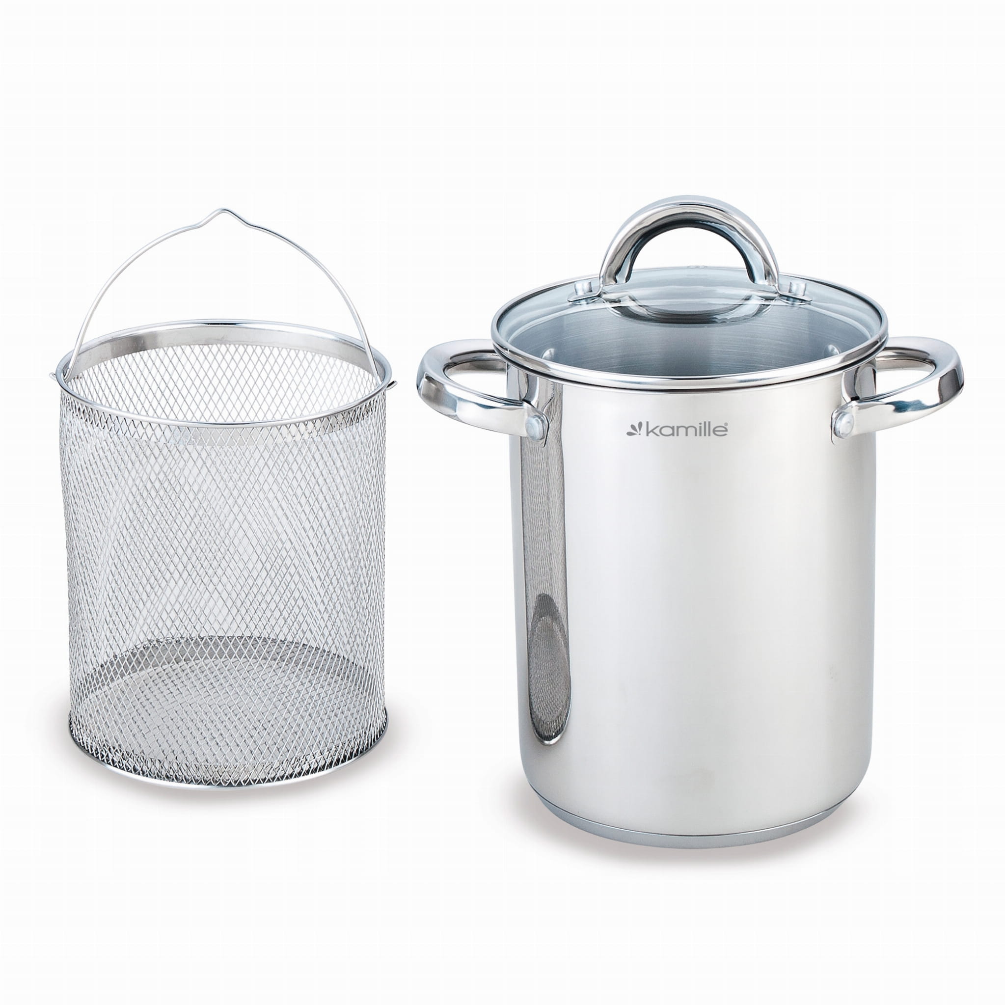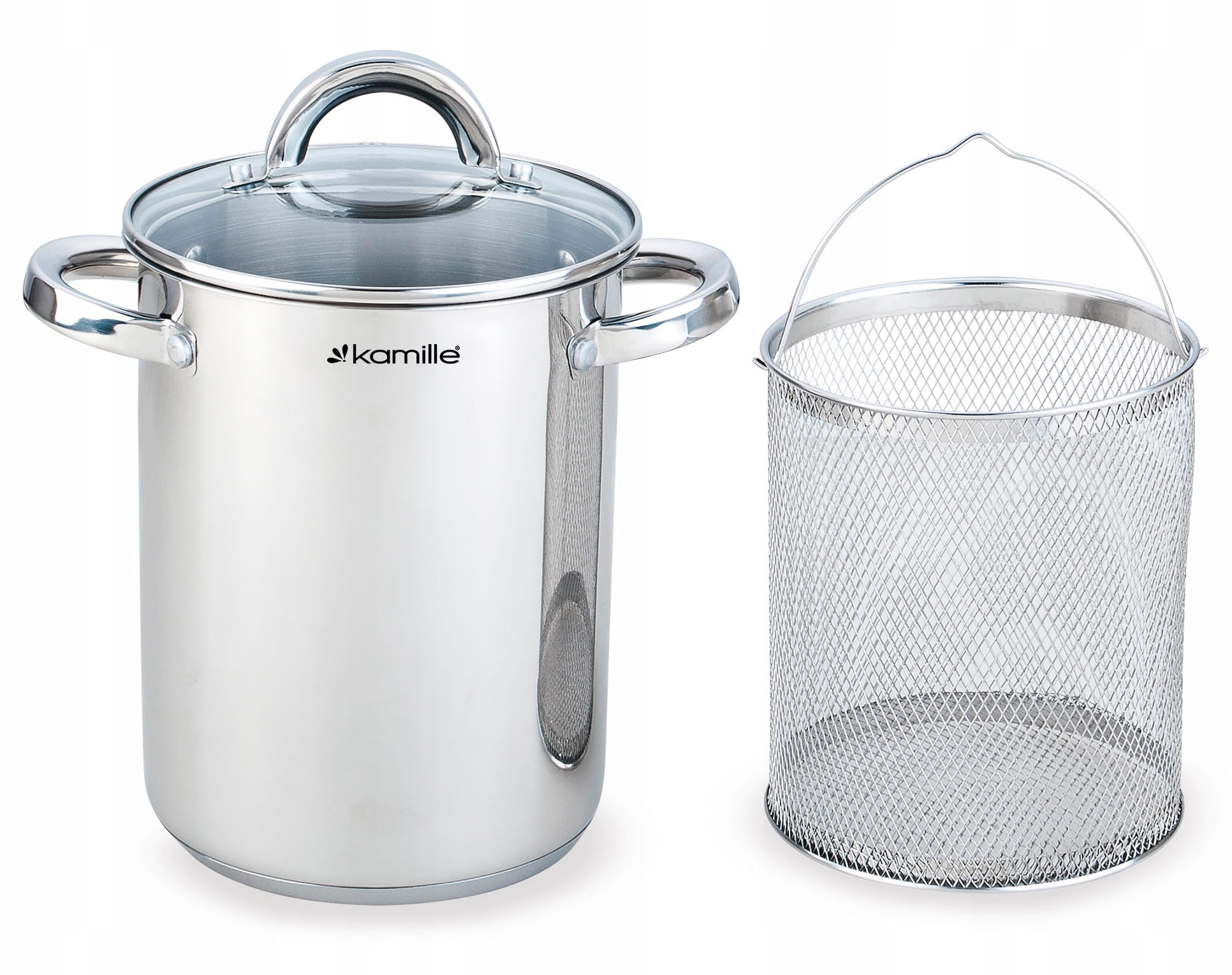 Rewelacyjny garnek Kamille wielofunkcyjny wyposażony jest w ażurowy kosz z uchwytem, który wyjmiesz z naczynia odsączając z wody lub tłuszczu, dzięki niemu nie potrzebujesz już durszlaka czy łyżki cedzakowej. Idealny do gotowania szparagów, parowania i blanszowania warzyw, gotowania makaronu oraz smażenia frytek. Garnek został wykonany z wysokiej jakości stali nierdzewnej, której zawdzięcza swoją wysoką wytrzymałość i odporność. Energooszczędne wielowarstwowe dno, dzięki któremu garnek szybko się nagrzewa i na długo utrzymuje odpowiednią temperaturę. Szklana pokrywka z otworem odprowadzającym parę wykonana została z odpornego na wysokie temperatury szkła hartowanego.
