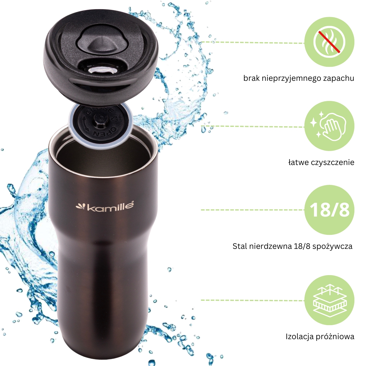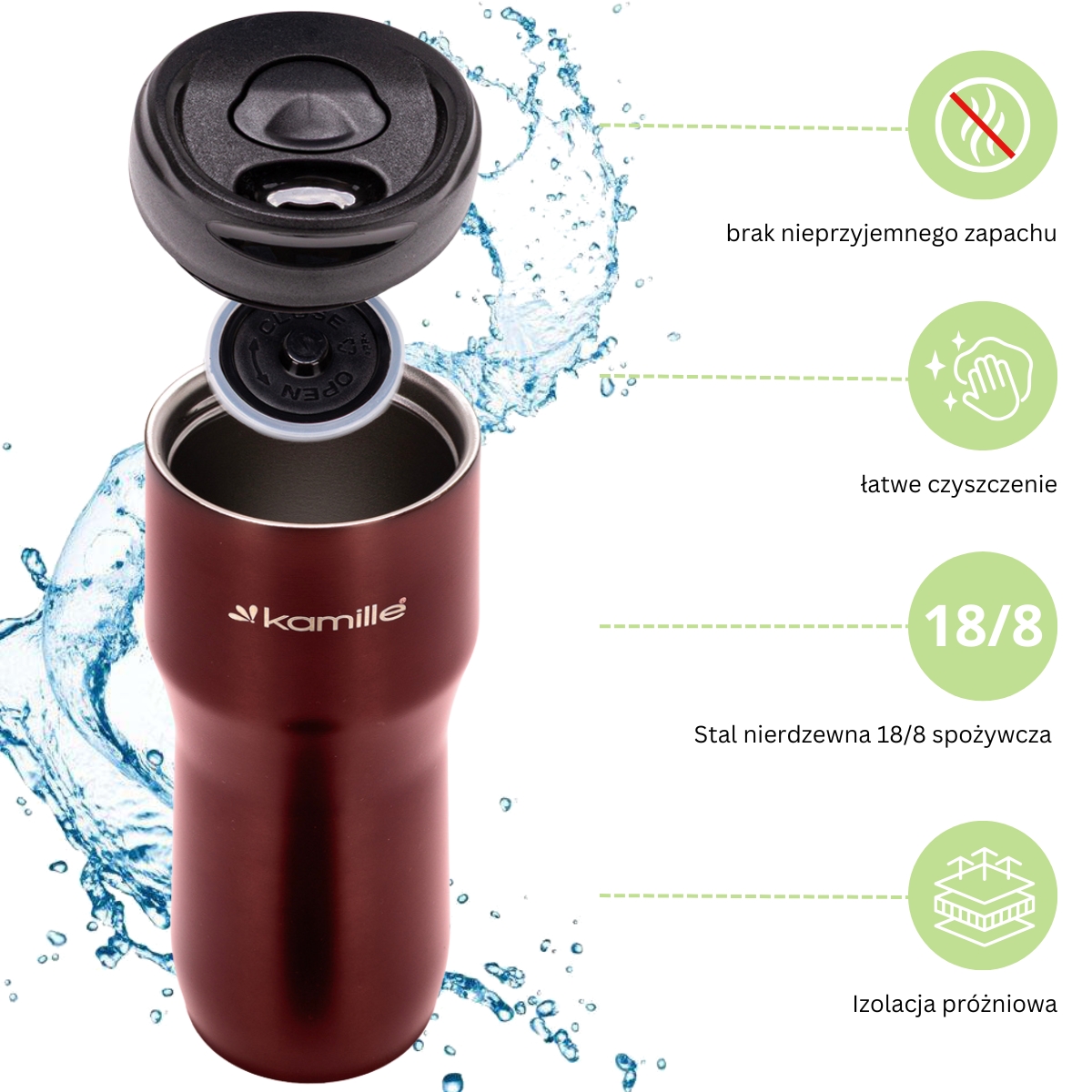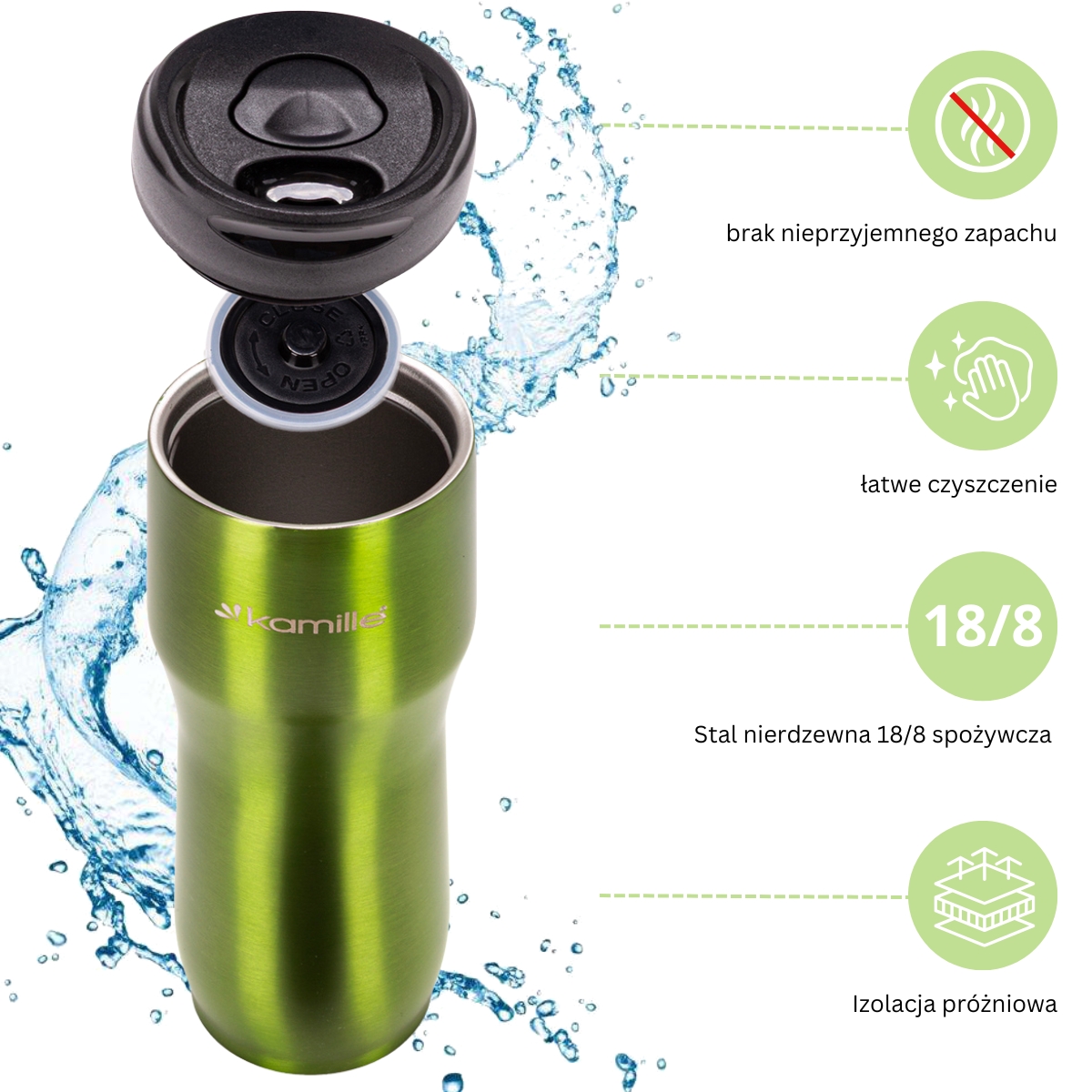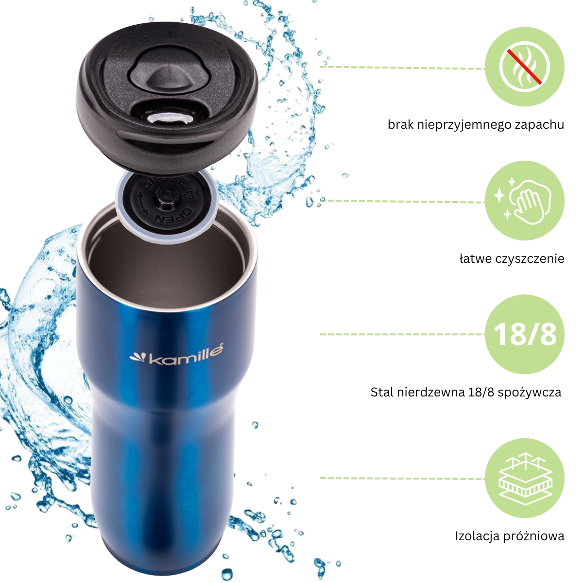 Kubek termiczny sportowy KAMILLE jest niezbędny w samochodzie, idealnie nadaje się do pracy lub szkoły jak w chłodniejsze tak i ciepłe dni. Wykonany z wysokiej jakości stali nierdzewnej 18/10, która jest ekologiczna i bezpieczna dla zdrowia. Doskonale trzyma ciepło lub zimno i jest w 100% szczelny. Designerskie wykonanie w przepięknych kolorach. Prosty i wygodny w obsłudze, odporny na wstrząsy.