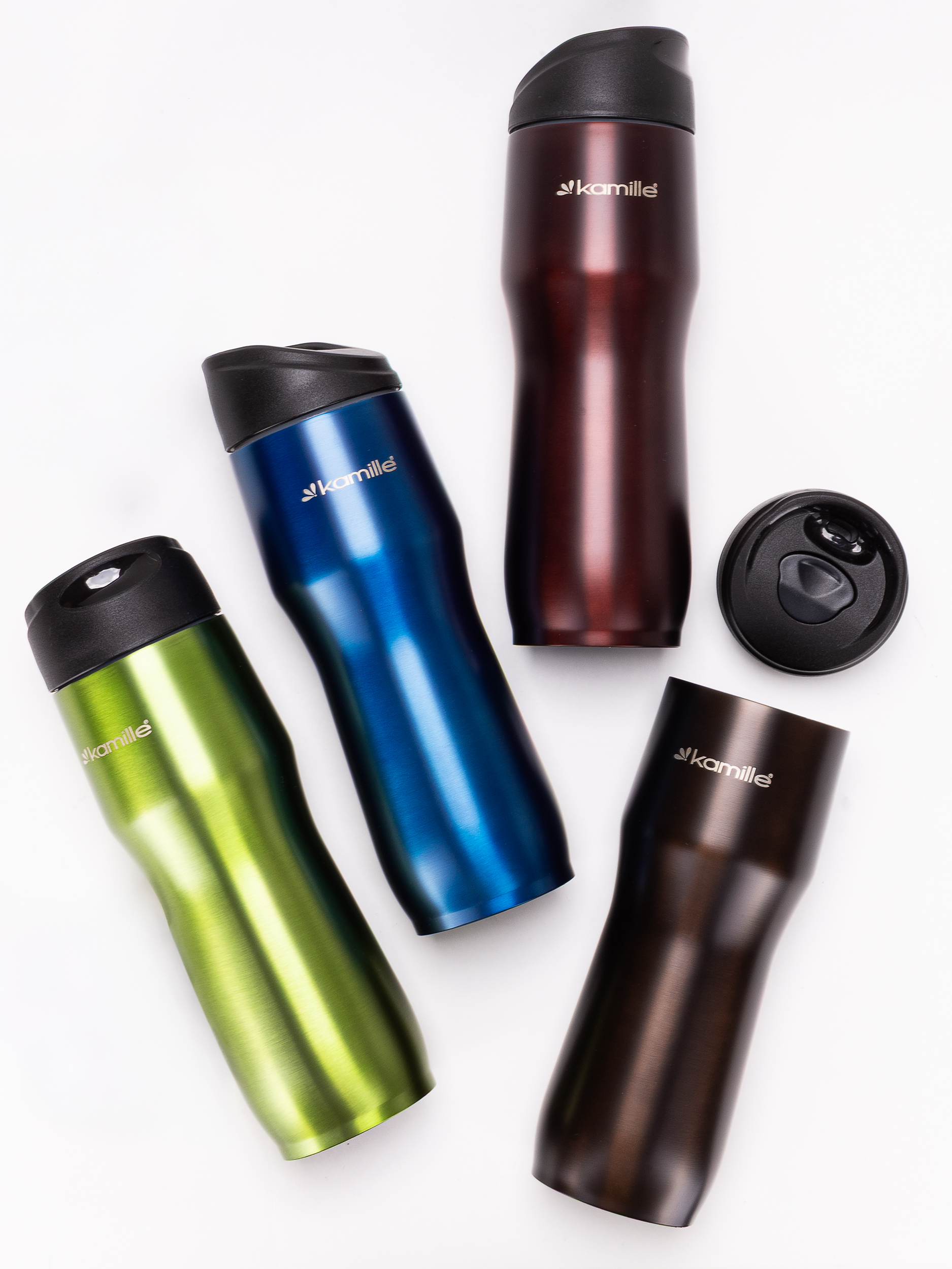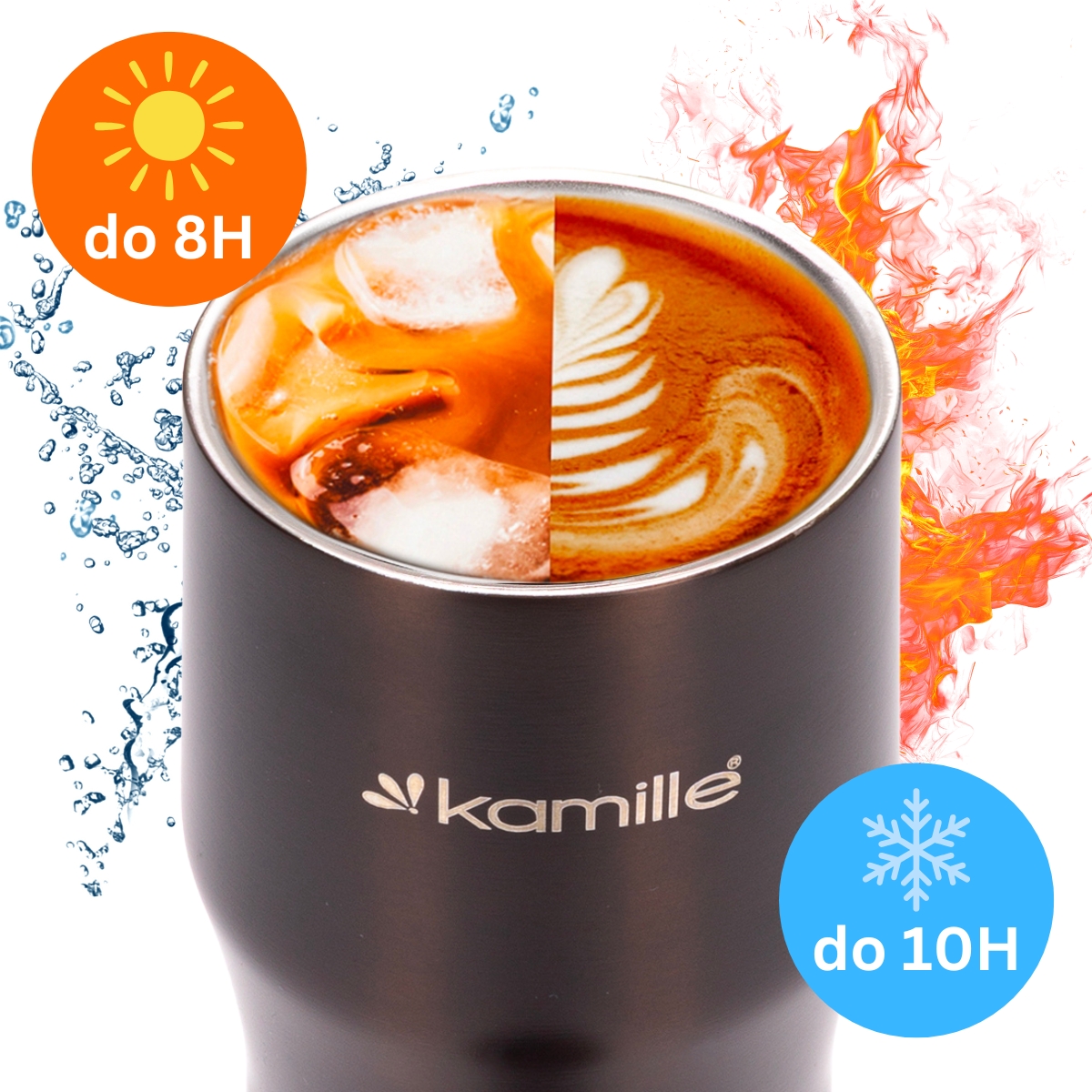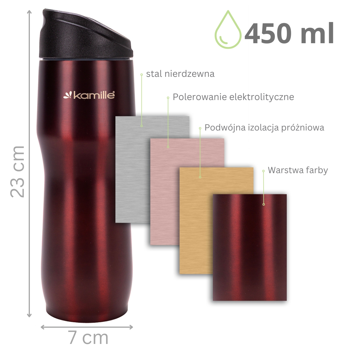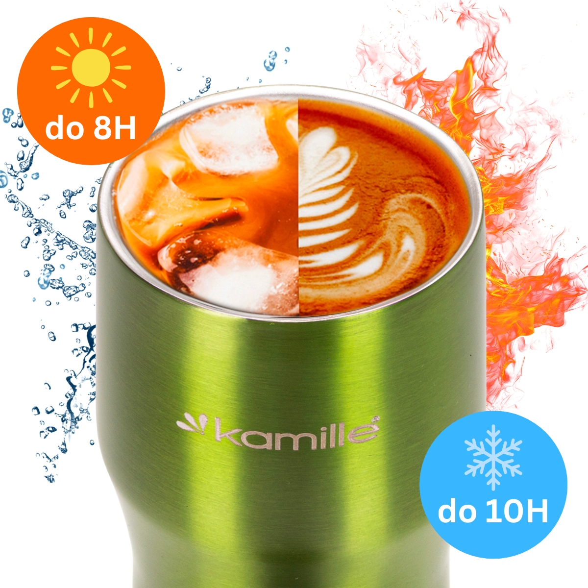 Kubek termiczny sportowy KAMILLE jest niezbędny w samochodzie, idealnie nadaje się do pracy lub szkoły jak w chłodniejsze tak i ciepłe dni. Wykonany z wysokiej jakości stali nierdzewnej 18/10, która jest ekologiczna i bezpieczna dla zdrowia. Doskonale trzyma ciepło lub zimno i jest w 100% szczelny. Designerskie wykonanie w przepięknych kolorach. Prosty i wygodny w obsłudze, odporny na wstrząsy.