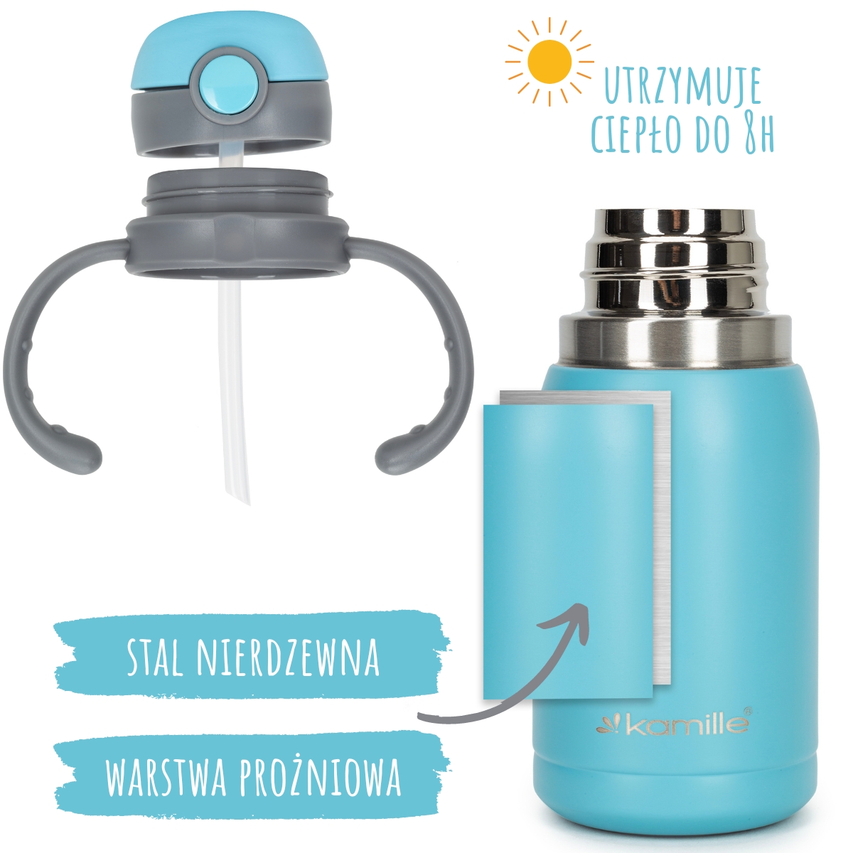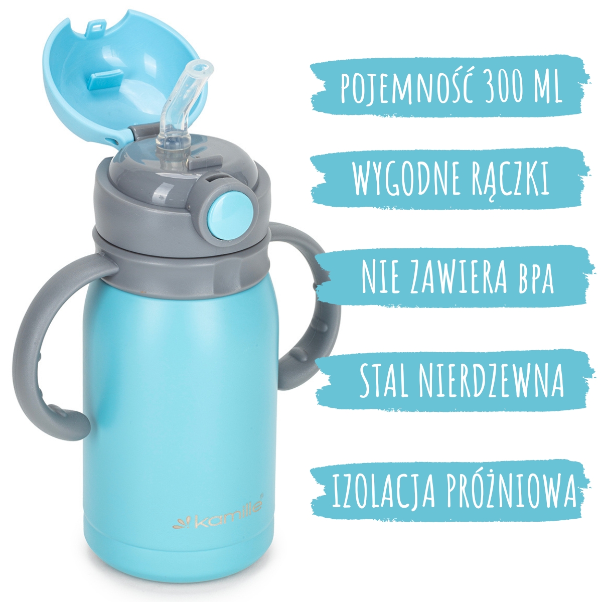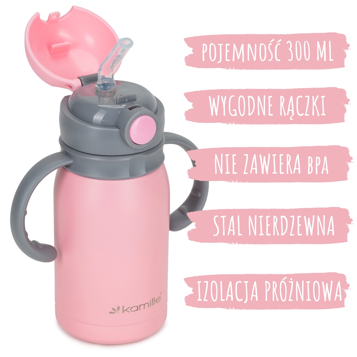 Kubek termiczny dla dzieci Kamille wykonany z wysokiej jakości stali nierdzewnej, która jest ekologiczna i bezpieczna dla zdrowia. Kwalifikuje się niezawodnością, kompaktowym rozmiarem, wysoką jakością i estetycznym designem.Taki kubek termiczny będzie niezamienny dla waszego dziecka w samochodzie, na spacerze lub w podróży. Doskonale trzyma ciepło lub zimno i jest w 100% szczelny. Prosty i wygodny w obsłudze, odporny na wstrząsy.