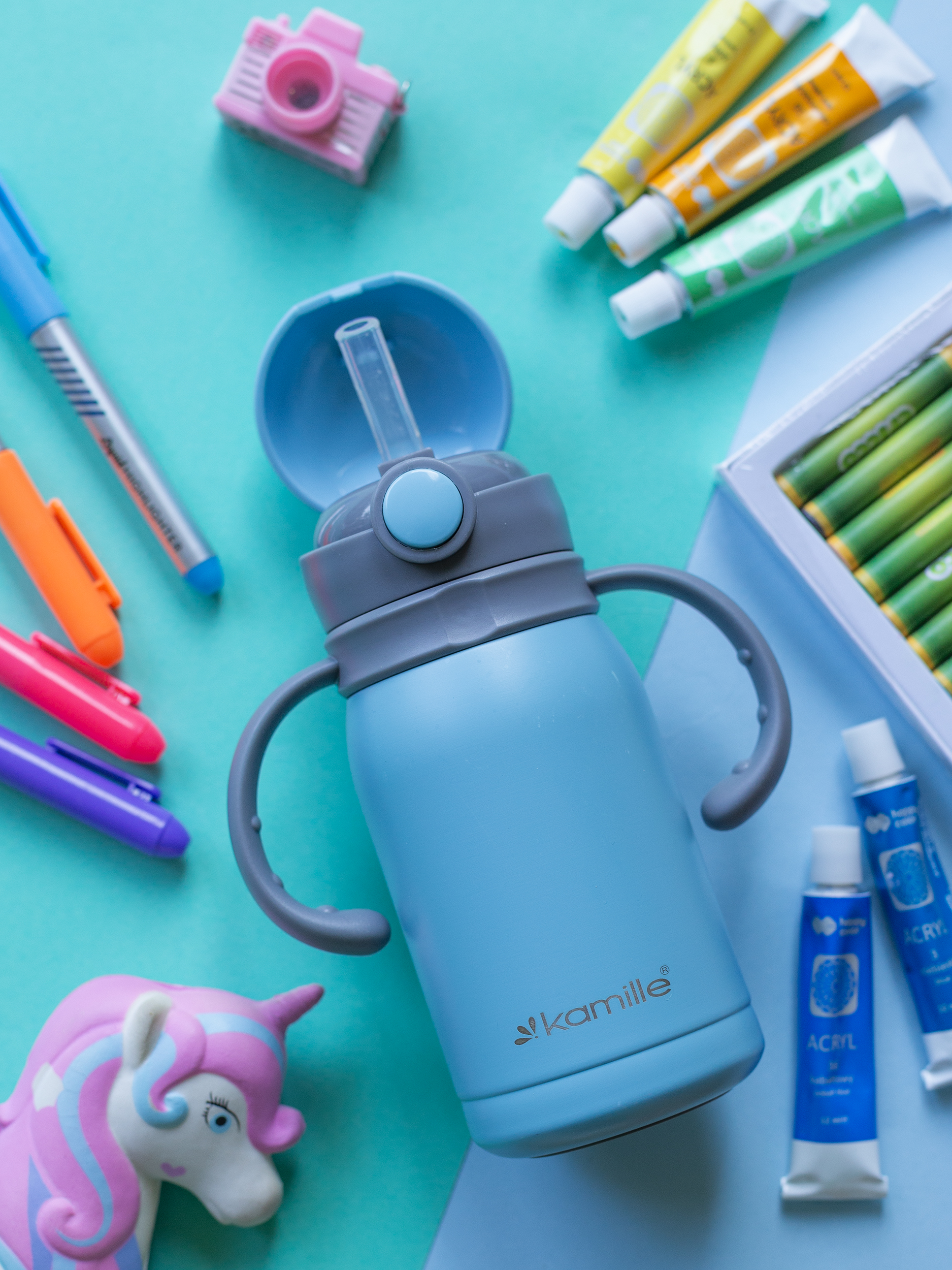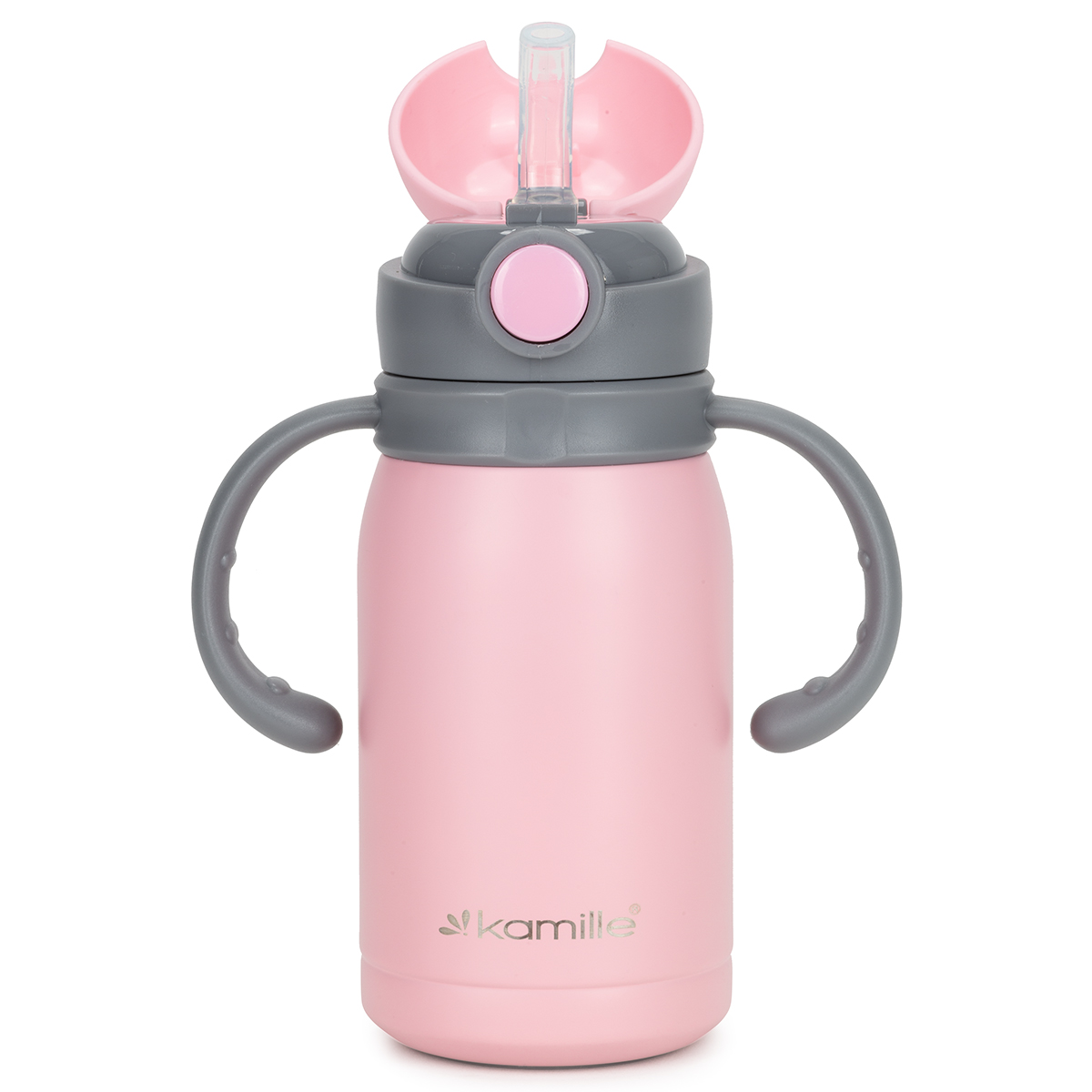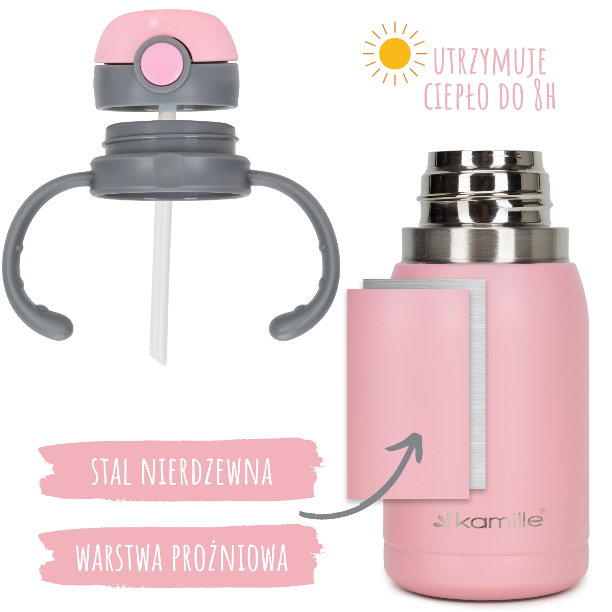 Kubek termiczny dla dzieci Kamille wykonany z wysokiej jakości stali nierdzewnej, która jest ekologiczna i bezpieczna dla zdrowia. Kwalifikuje się niezawodnością, kompaktowym rozmiarem, wysoką jakością i estetycznym designem.Taki kubek termiczny będzie niezamienny dla waszego dziecka w samochodzie, na spacerze lub w podróży. Doskonale trzyma ciepło lub zimno i jest w 100% szczelny. Prosty i wygodny w obsłudze, odporny na wstrząsy.