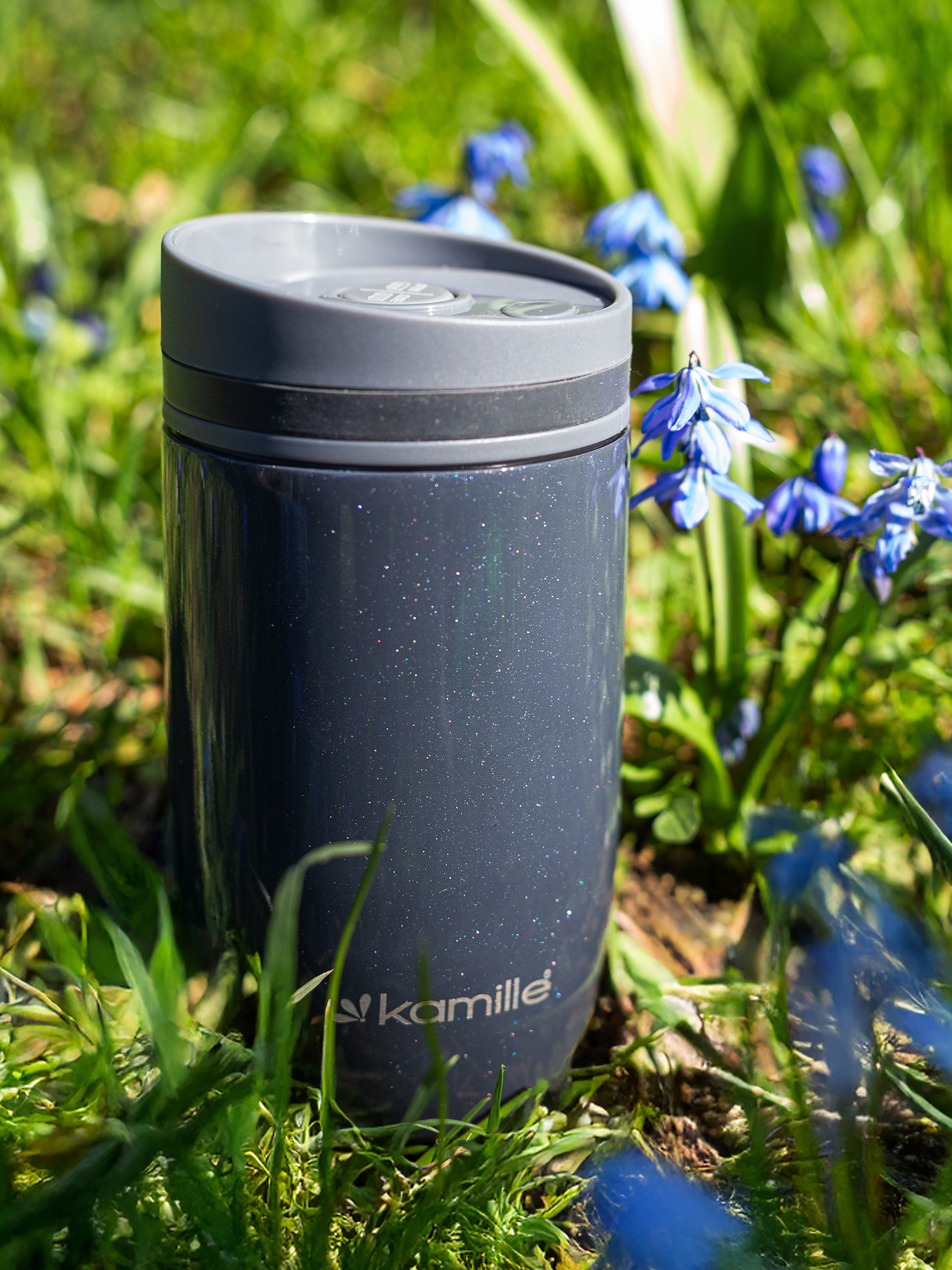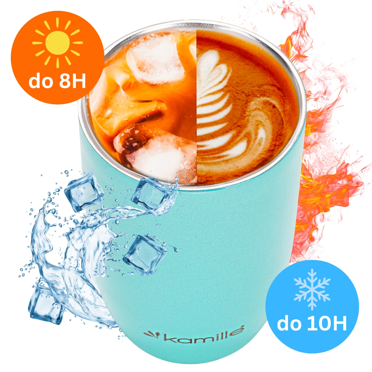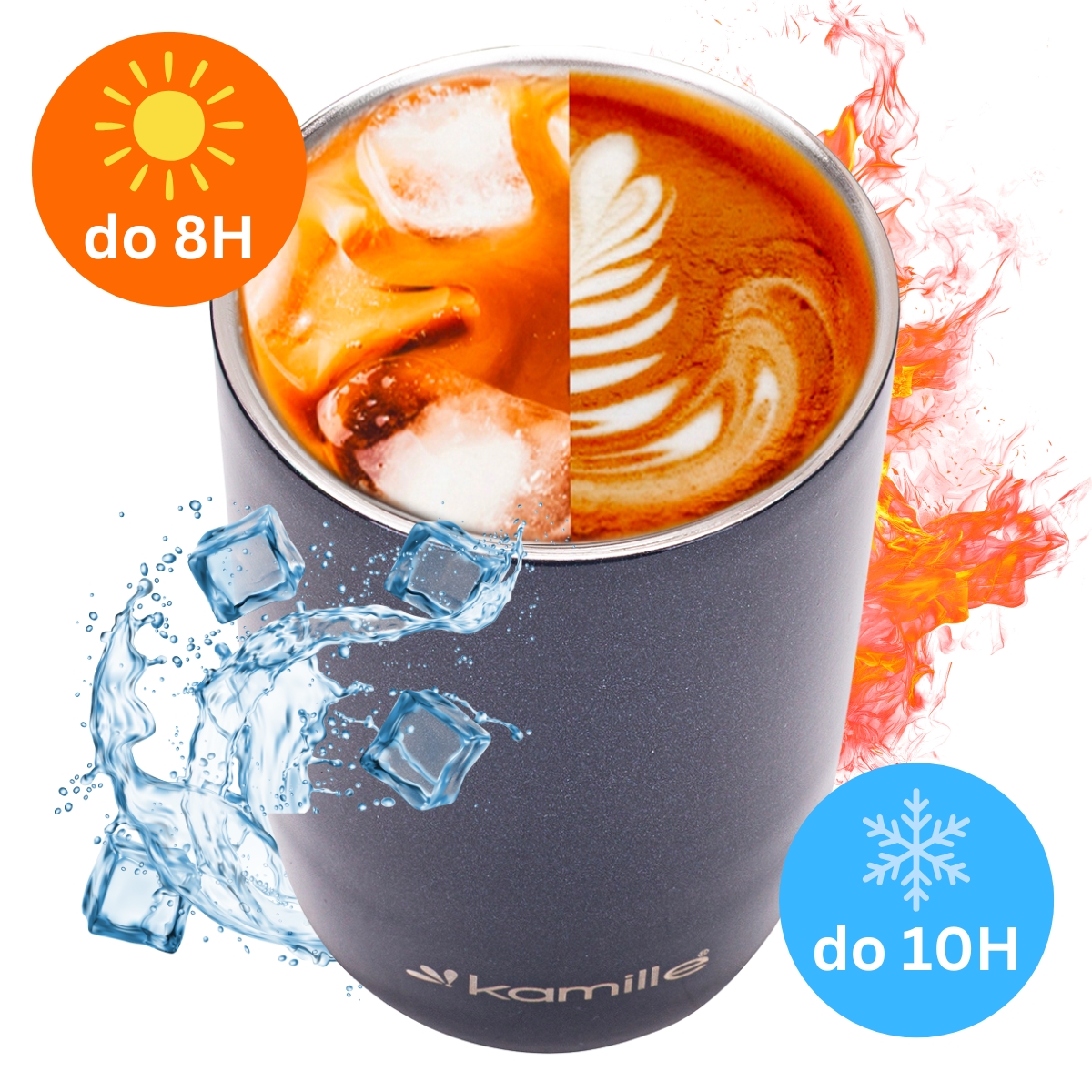 - izolacja próżniowa sprawia że kubek długo utrzymuje temperaturę wewnątrz, podobnie jak termos