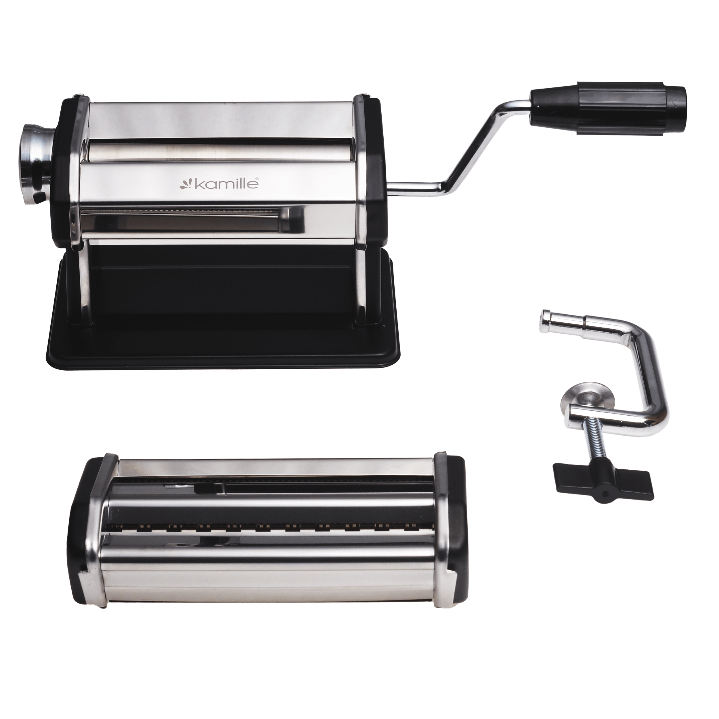 Maszynka do wałkowania ciasta i robienia makaronu Kamille wykonana z wysokiej jakości stali nierdzewnej oraz tworzywa sztucznego. Profesjonalny zestaw do makaronów pozwala na własnoręczne przyrządzenie świeżego makaronu w każdej chwili. Maszynka jest praktyczna, wysokiej jakości, łatwa w obsłudze i czyszczeniu. Maszynka pozwala wałkować ciasto o szerokości 15 cm i regulować jego grubość za pomocą pokrętła. Posiada antypoślizgowe podstawki i klamrę mocującą do blatu.