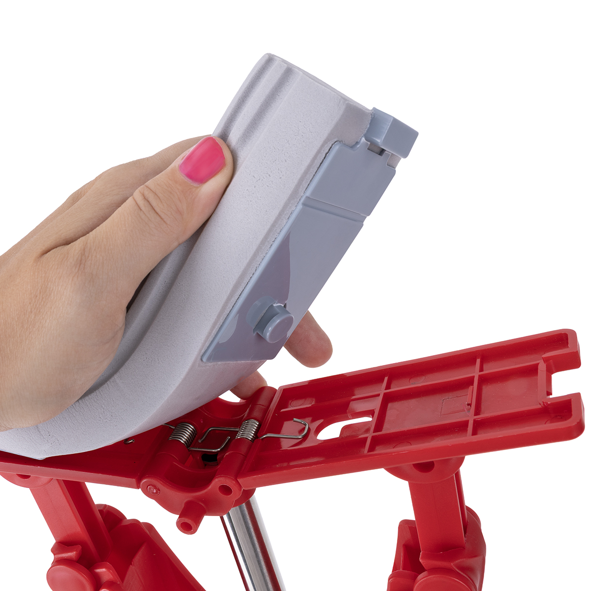 Mop wyposażony jest w praktyczny system mocowania, który umożliwia szybkie i wygodne zakładanie oraz zdejmowanie nakładki z PVA. Dzięki temu wymiana wkładu zajmuje dosłownie kilka sekund, a całość trzyma się stabilnie podczas sprzątania.