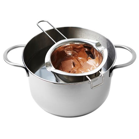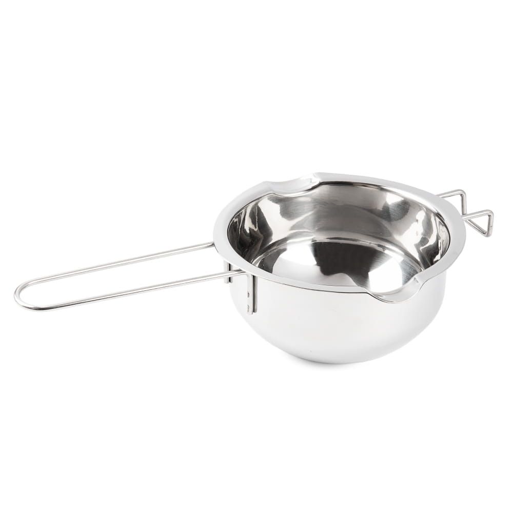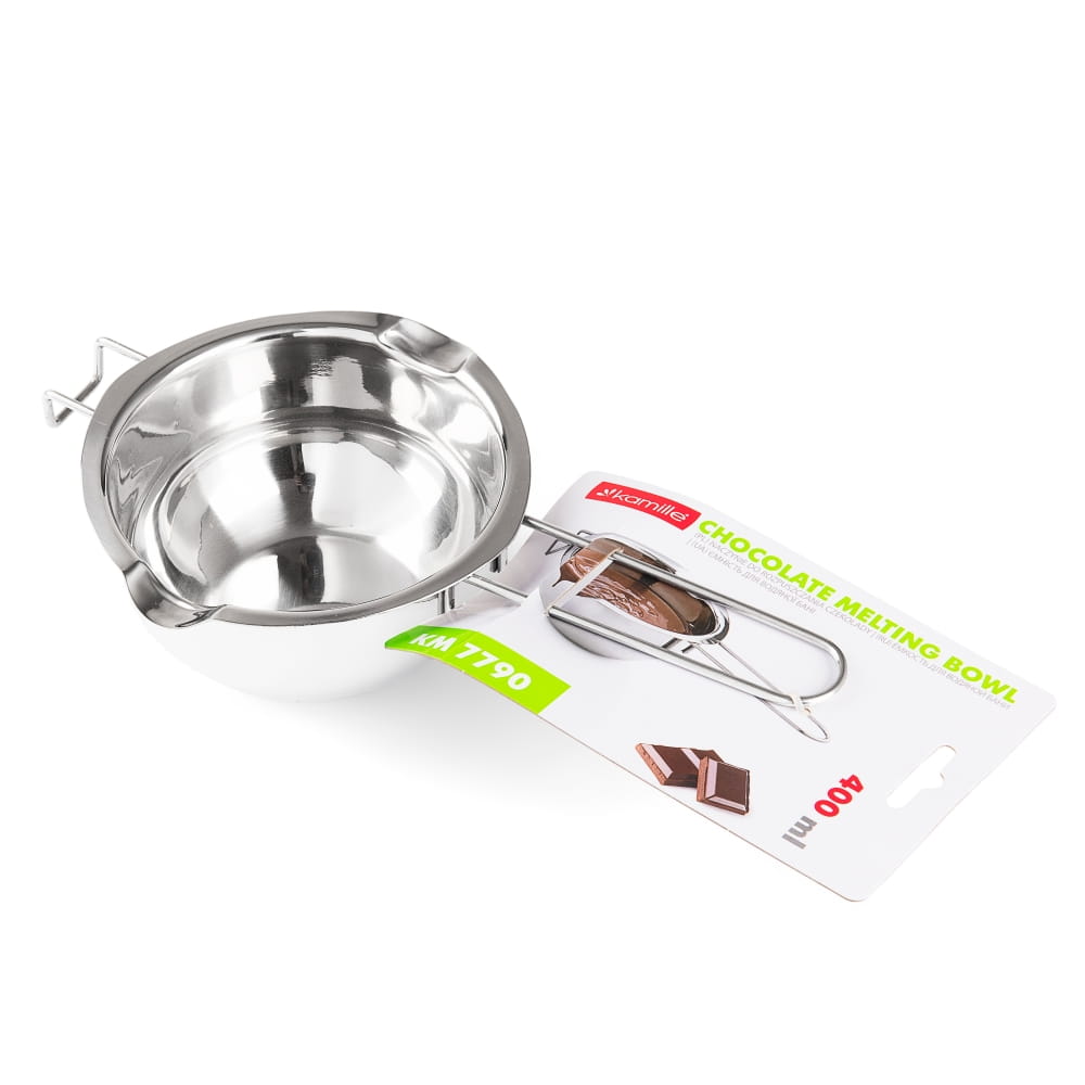 Miska do rozpuszczania czekolady Kamille to praktyczne urządzenie do rozpuszczania czekolady oraz jej temperowania. Dzięki swojej budowie pozwala rozpuszczać czekoladę bez kontaktu z wodą. Produkt wykonany z wysokiej jakości stali nierdzewnej. Doskonała do rozpuszczania produktów w kąpieli wodnej – polew czekoladowych, kremów, masła, czekolady itp.