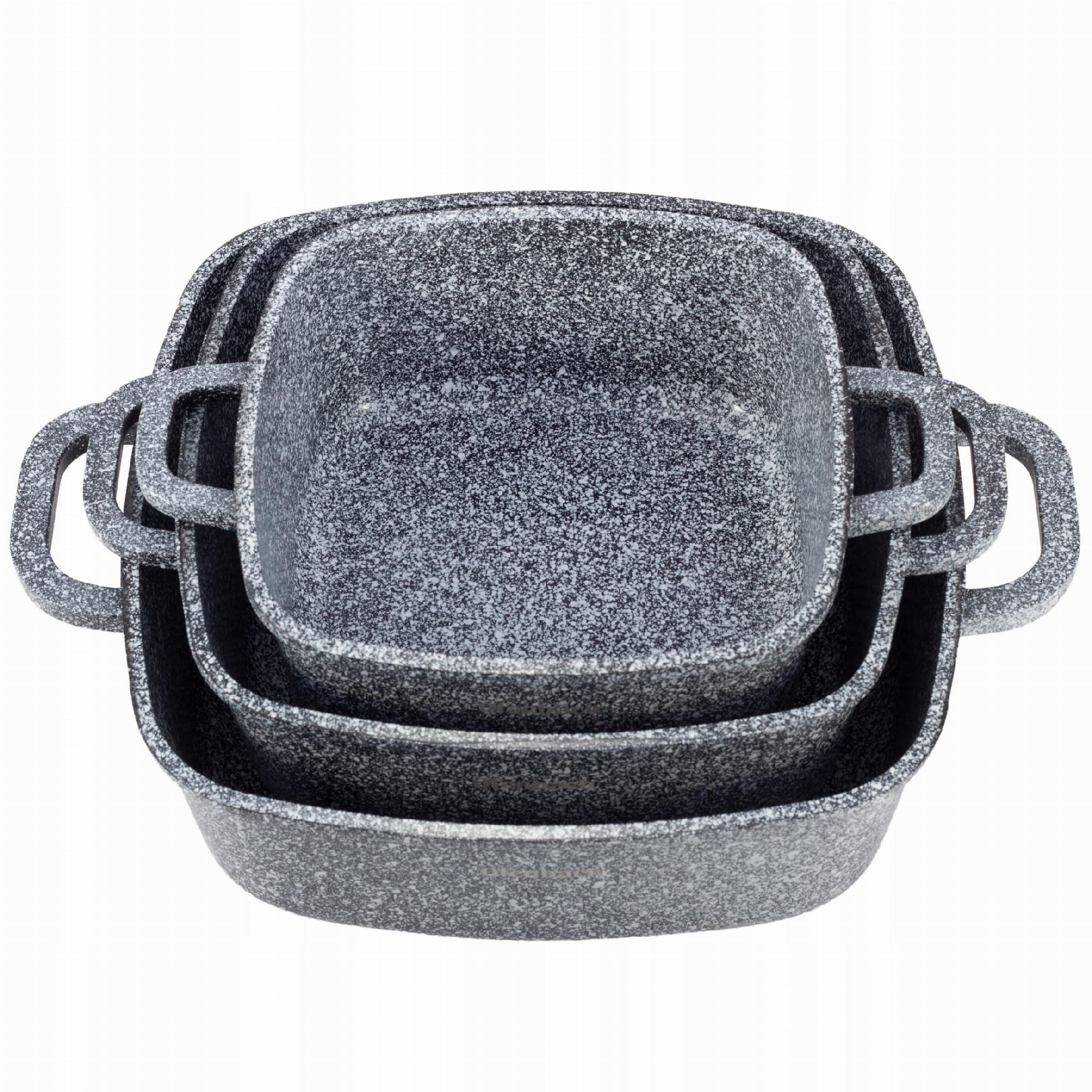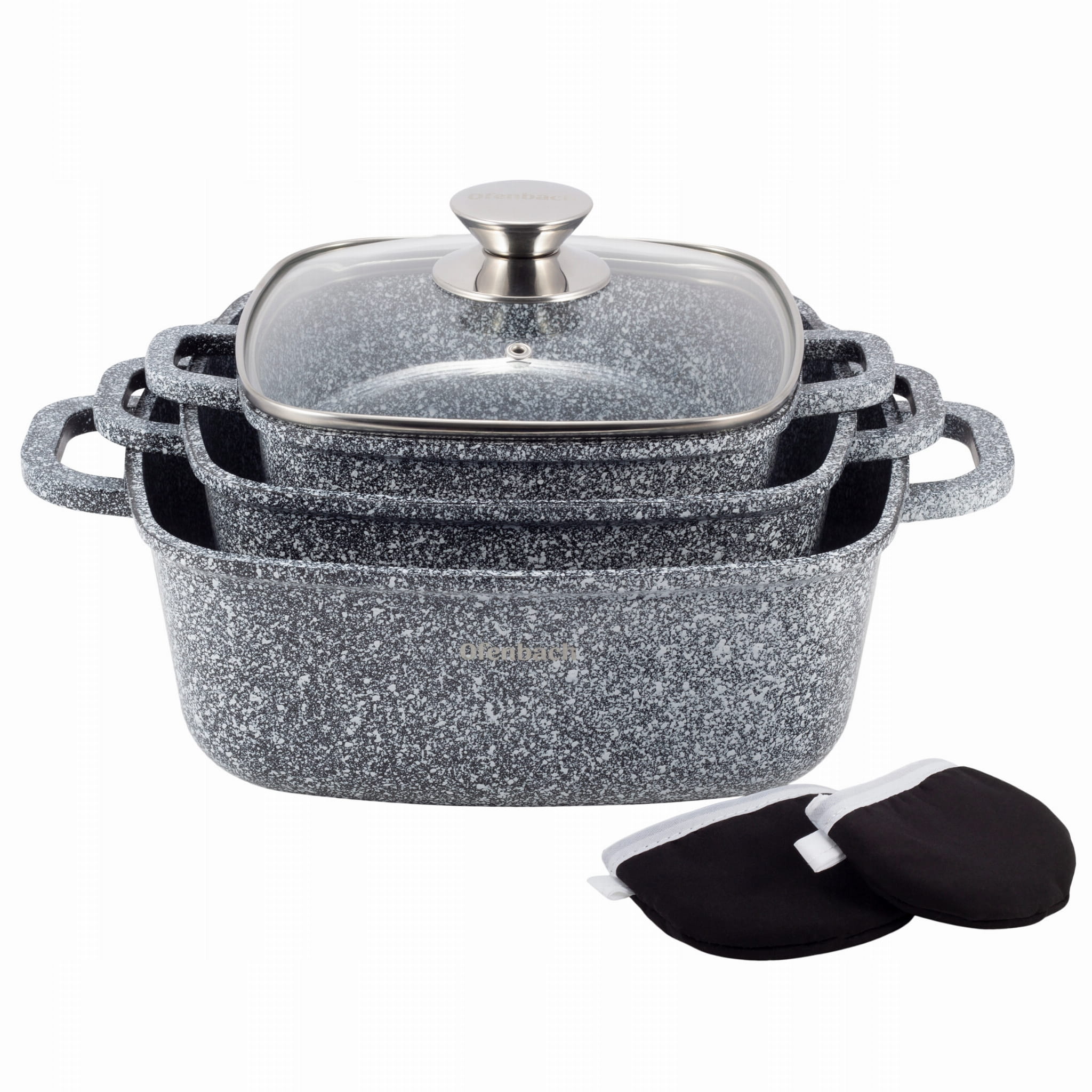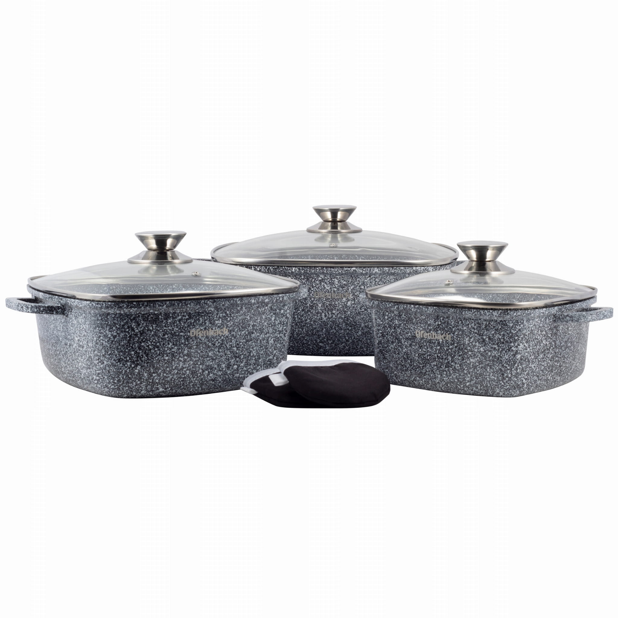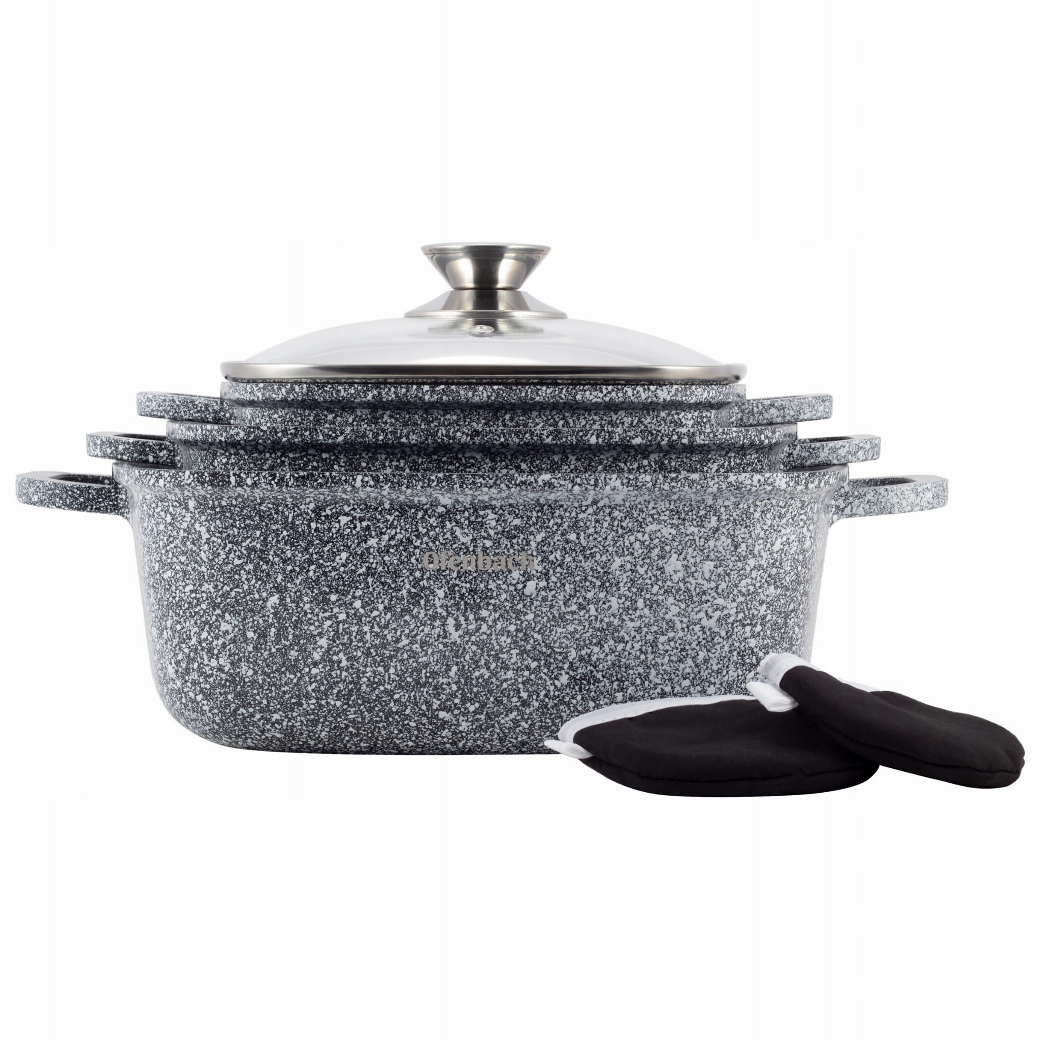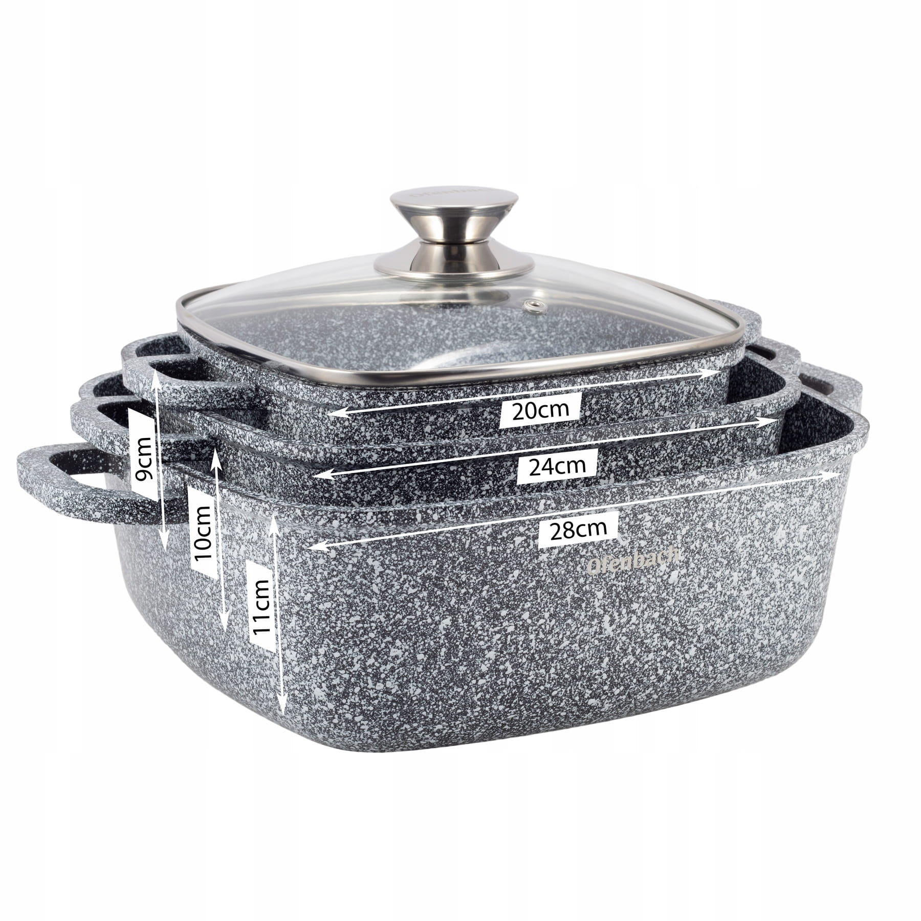 Początki garncarstwa sięgają roku 10 000 p.n.e. W Japonii zaczęto wtedy wyrabiać pierwsze naczynia z gliny, które służyły do przechowywania pokarmów. Współcześnie nie wyobrażamy sobie życia bez naczyń kuchennych czy garnków. Jest to jedno z podstawowych naczyń, które dzięki swojej uniwersalności służy Nam na co dzień w kuchni na wiele sposobów. Zestaw zawiera garnki o różnych rozmiarach i pojemnościach, co pozwala na przygotowanie różnorodnych i apetycznych posiłków z wielu składników. Komplet garnków wykonany jest z wysokiej jakości odlewu aluminium z powłoką granitową, dzięki czemu posłuży nam na dłuższy czas. Dzięki zastosowanej powłoce, garnki są bardziej odporne na uszkodzenia oraz zarysowania. Dodatkowo eliminuje przypalanie oraz przywieranie potraw. Indukcyjne dno zapewnia szybkie nagrzanie i równomierne rozprowadzenie ciepła co przyczynia się do oszczędności czasu oraz pieniędzy. Pokrywki wykonane z żaroodpornego szkła z odpowietrznikiem pomogą przy odprowadzeniu nadmiaru pary z wnętrza garnka. Materiałowe łapki dołączone do zestawu zapewnią bezpieczny chwyt podczas łapania garnka lub przenoszenia.