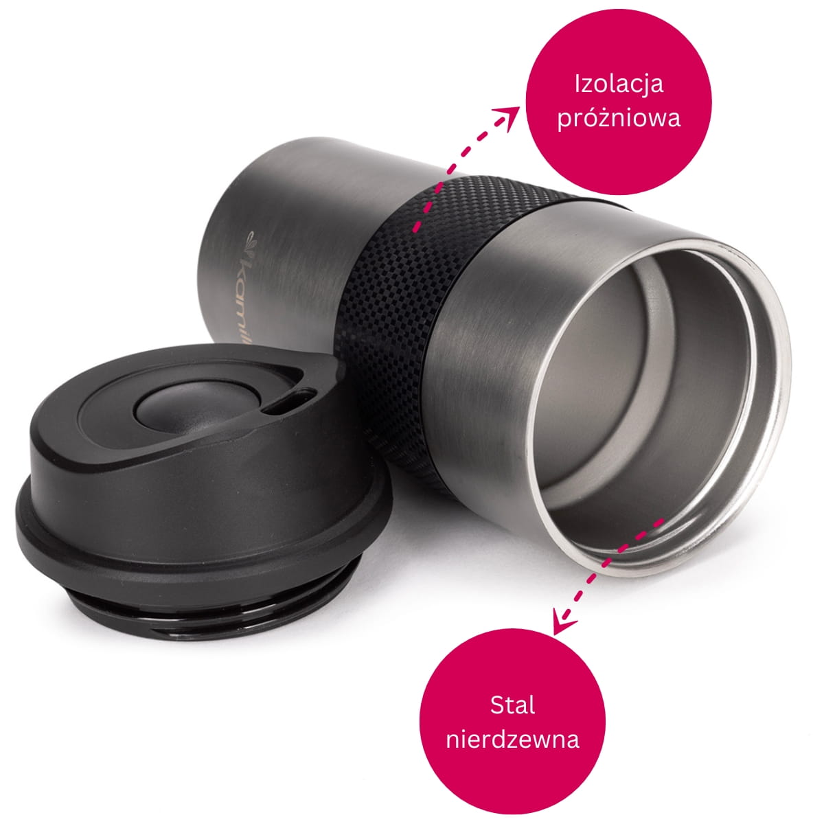 ✅ Izolacja próżniowa sprawia że kubek długo utrzymuje temperaturę wewnątrz, podobnie jak termos.
