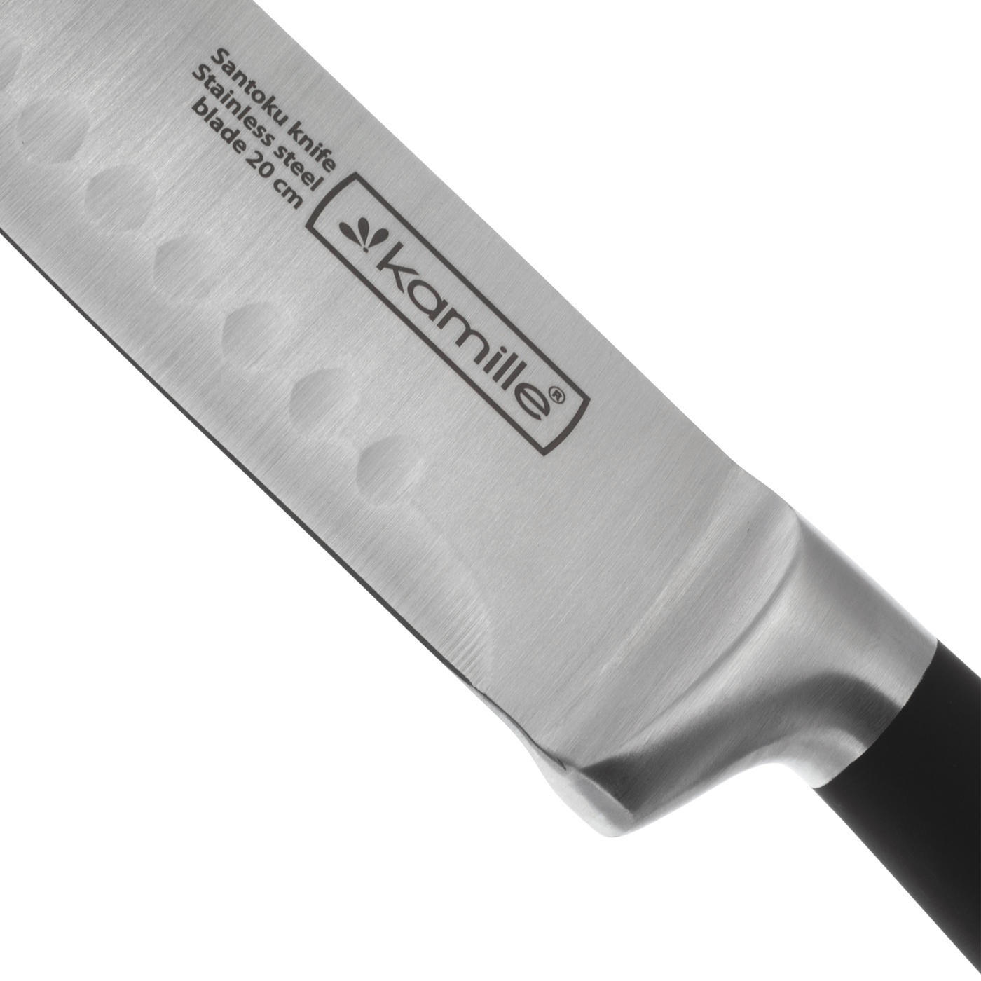 Bardzo elegancki wielofunkcyjny Nóż japoński Santoku Kamille niezbędny w każdej kuchni. Ostrze o wysokiej jakości szlachetnej stali nierdzewnej, bardzo długa żywotność i niezwykły wygodny uchwyt, powodują że nie odejdziesz od blatu kuchennego. Nóż idealny do używania na co dzień. Podczas użytkowania jest bezpieczny i funkcjonalny. Dzięki materiałowi i technologii wykonania nóż jest bardzo ostry i twardy. Sprawi, że przygotowywanie zdrowych posiłków stanie się wyjątkowo łatwe.
