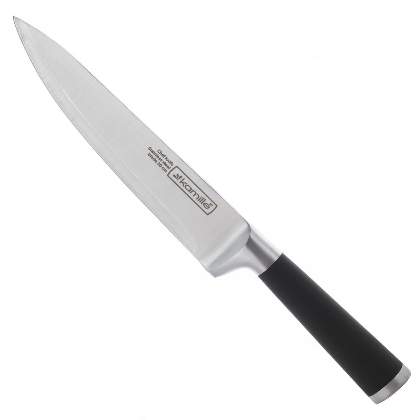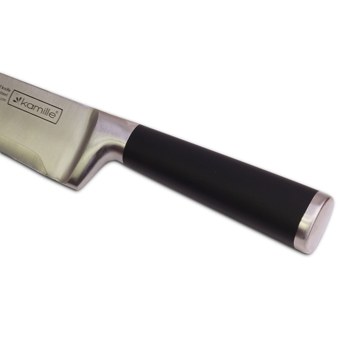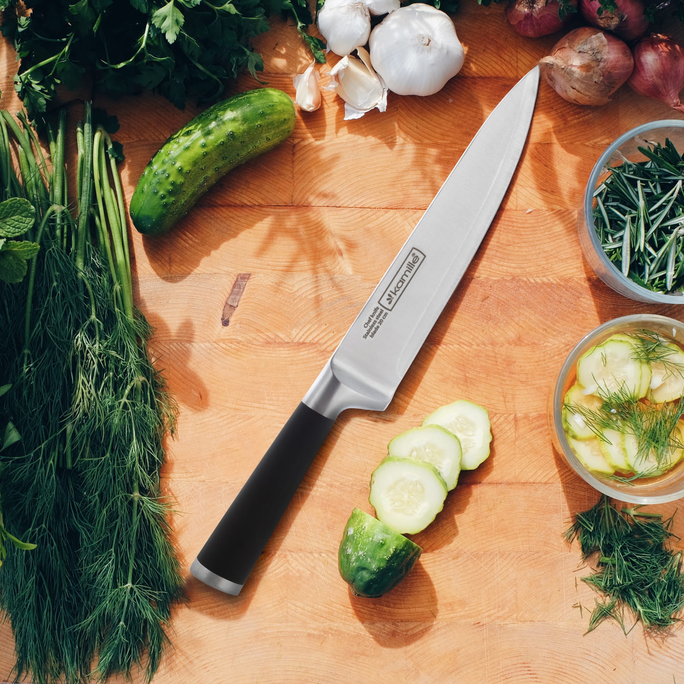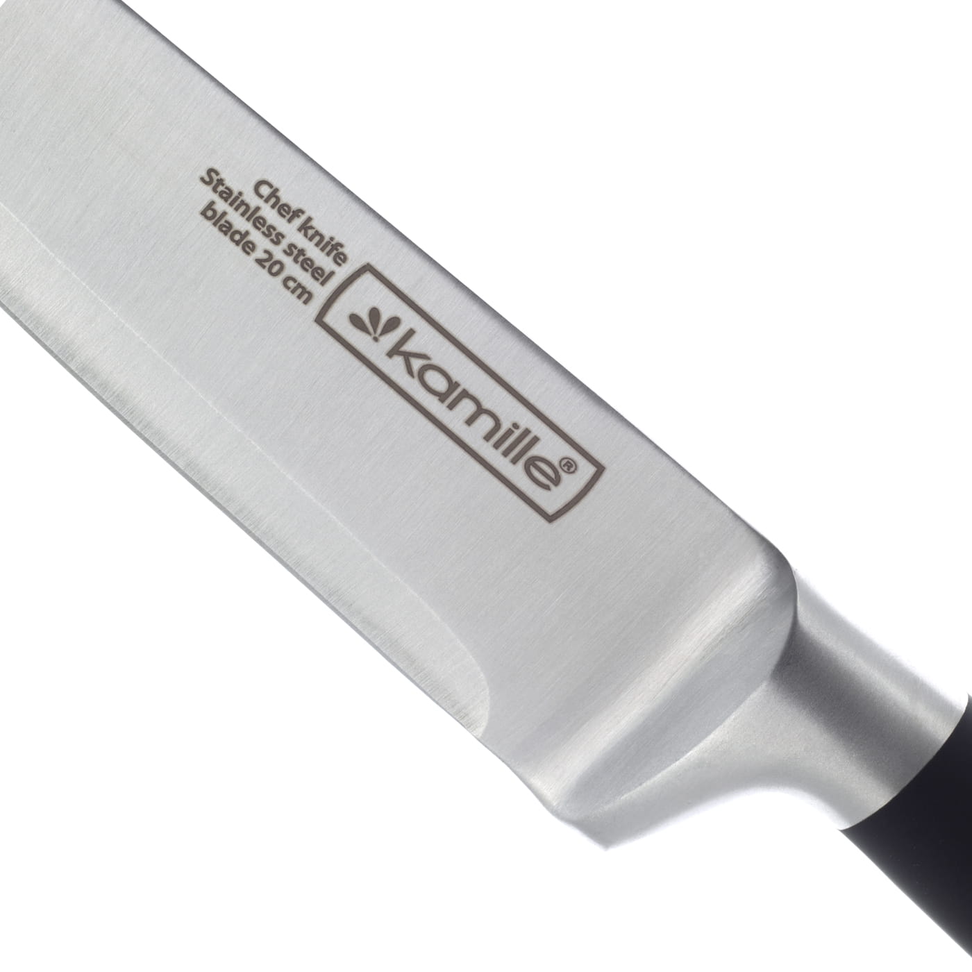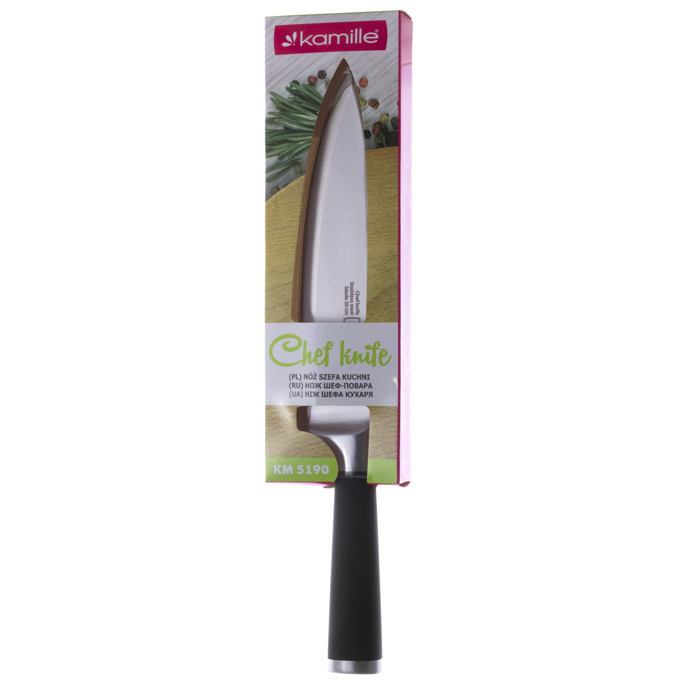 Bardzo elegancki wielofunkcyjny Nóż Szefa kuchni Kamille niezbędny w każdej kuchni. Ostrze o wysokiej jakości szlachetnej stali nierdzewnej, bardzo długa żywotność i niezwykły wygodny uchwyt, powodują że nie odejdziesz od blatu kuchennego. Nóż idealny do używania na co dzień. Podczas użytkowania jest bezpieczny i funkcjonalny. Dzięki materiałowi i technologii wykonania nóż jest bardzo ostry i twardy. Sprawi, że przygotowywanie zdrowych posiłków stanie się wyjątkowo łatwe.