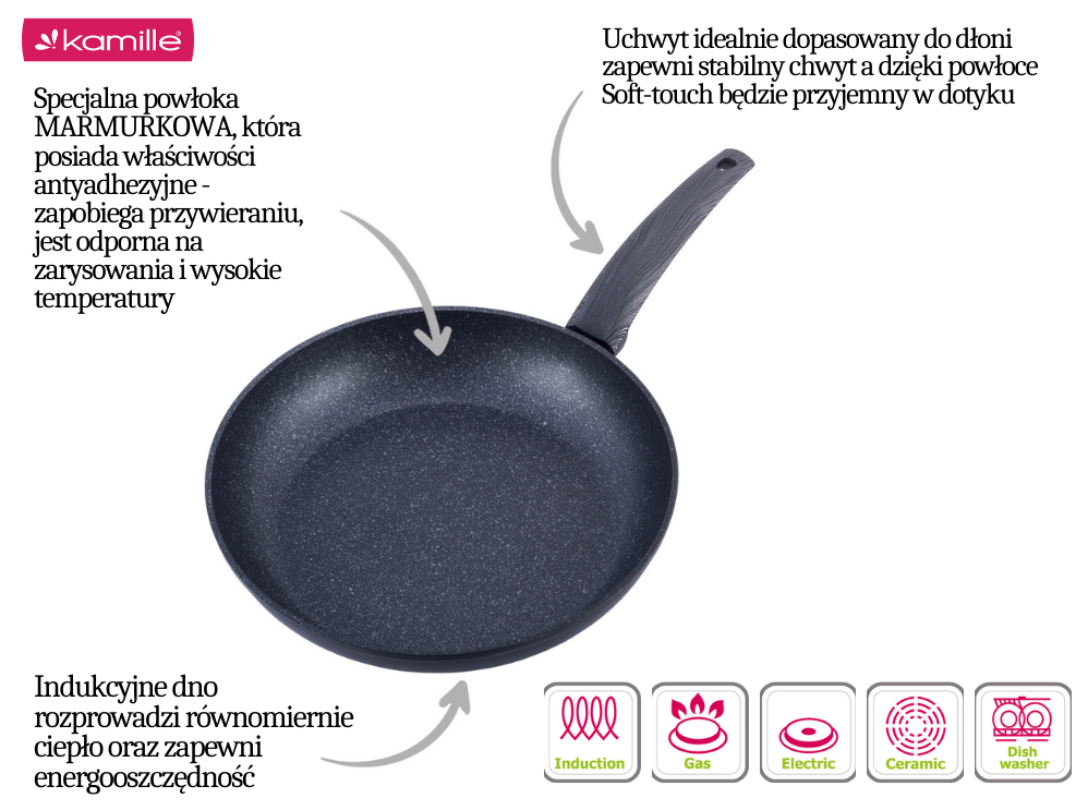 Smażenie to jedna z podstawowych kuchennych czynności. Żeby jej wykonywanie było wygodne, a otrzymane jedzenie smaczne i zdrowe, potrzebna jest dobra patelnia. Patelnie Kamille mogą być w pełni docenione przez właścicieli nowoczesnych kuchenek, to świetnej jakości patelnie zarówno dla profesjonalnych kucharzy jak i dla codziennego używania w domowej kuchni. Dzięki szerokiej gamie produktów, możesz wybrać swoją idealną patelnię względem rozmiaru czy konkretnego zastosowania.