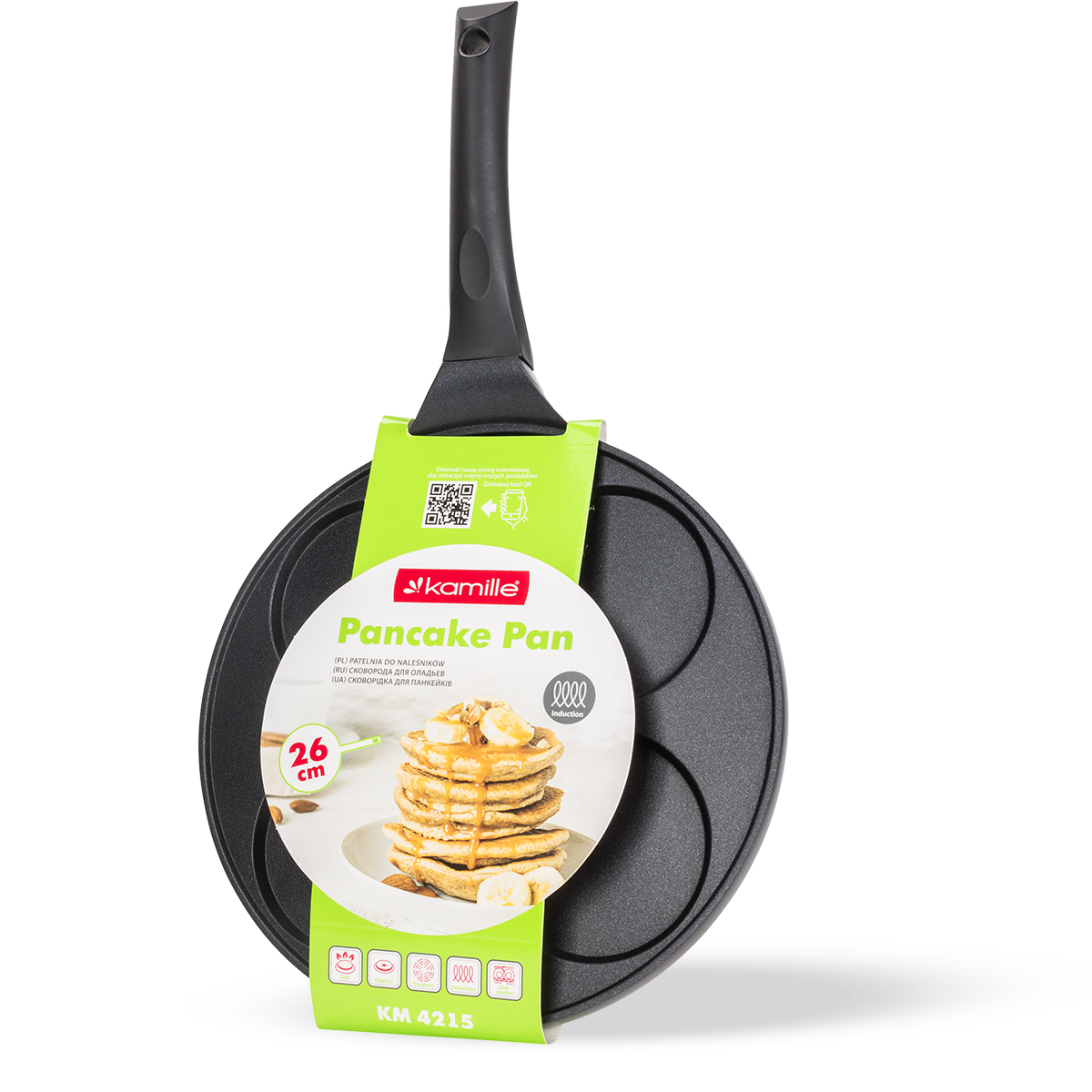 Patelnia do pancakes, naleśników, jajek i placków marki Kamille o średnicy 26 cm to doskonały wybór do każdej kuchni. Dzięki nieprzywierającej powłoce wysokiej jakości bez trudu przygotujesz pyszne naleśniki, pancakes, omlety i placki ziemniaczane bez przypalania i z minimalną ilością tłuszczu.