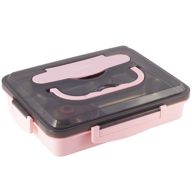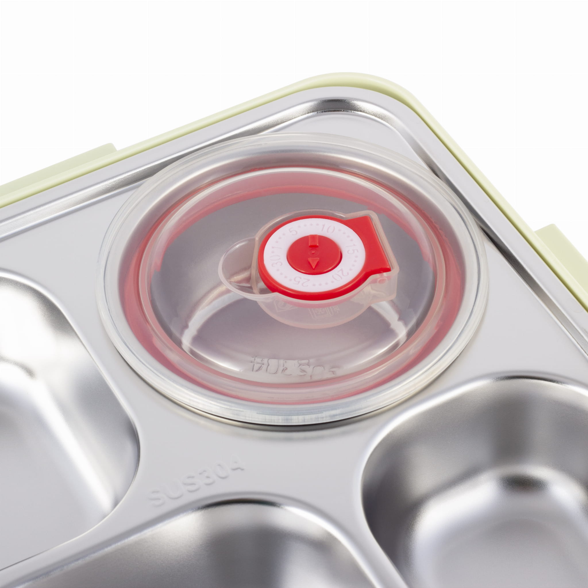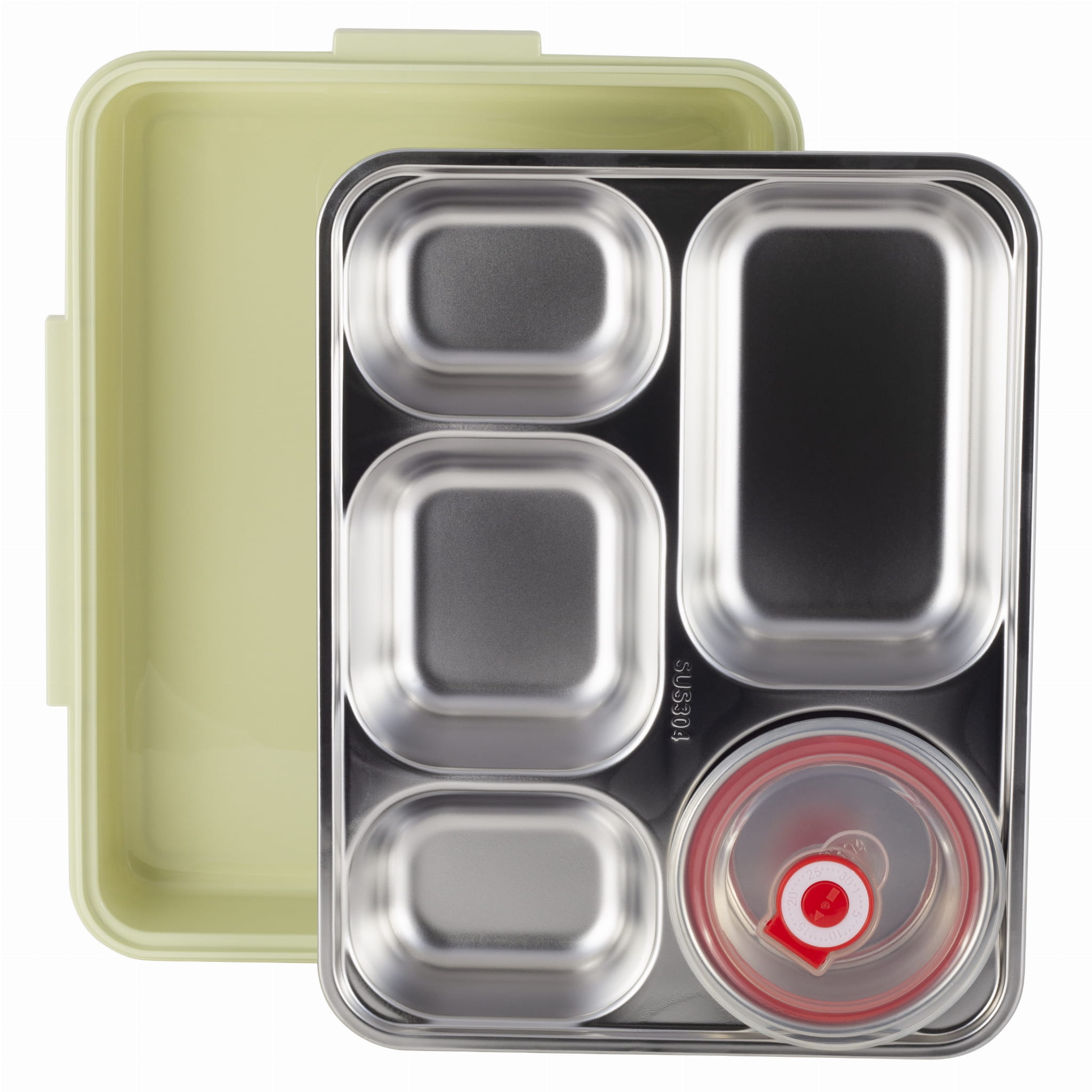 Dzięki 5 przegrodom na stalowej tacy, nie musisz martwić się wymieszaniem róznorodnych produktów i będziesz mieć pewność na odseparowanie ich od siebie. Dodatkowo w pojemniku znajduje się okrągły pojemniczek z pokrywką, który można wykorzystać np. do sosu.