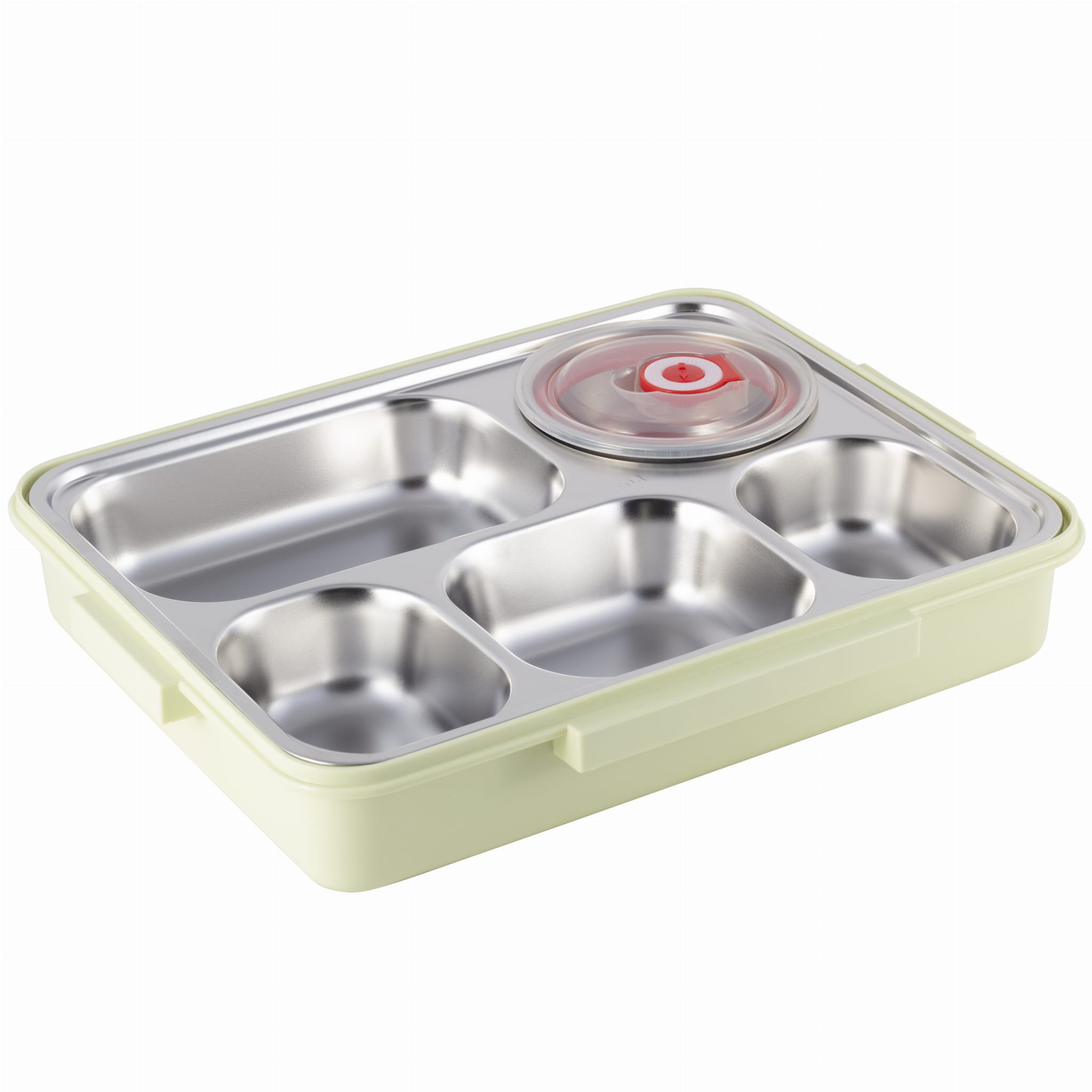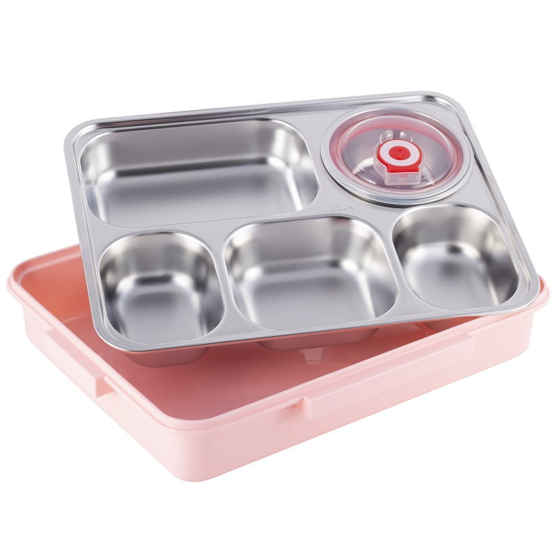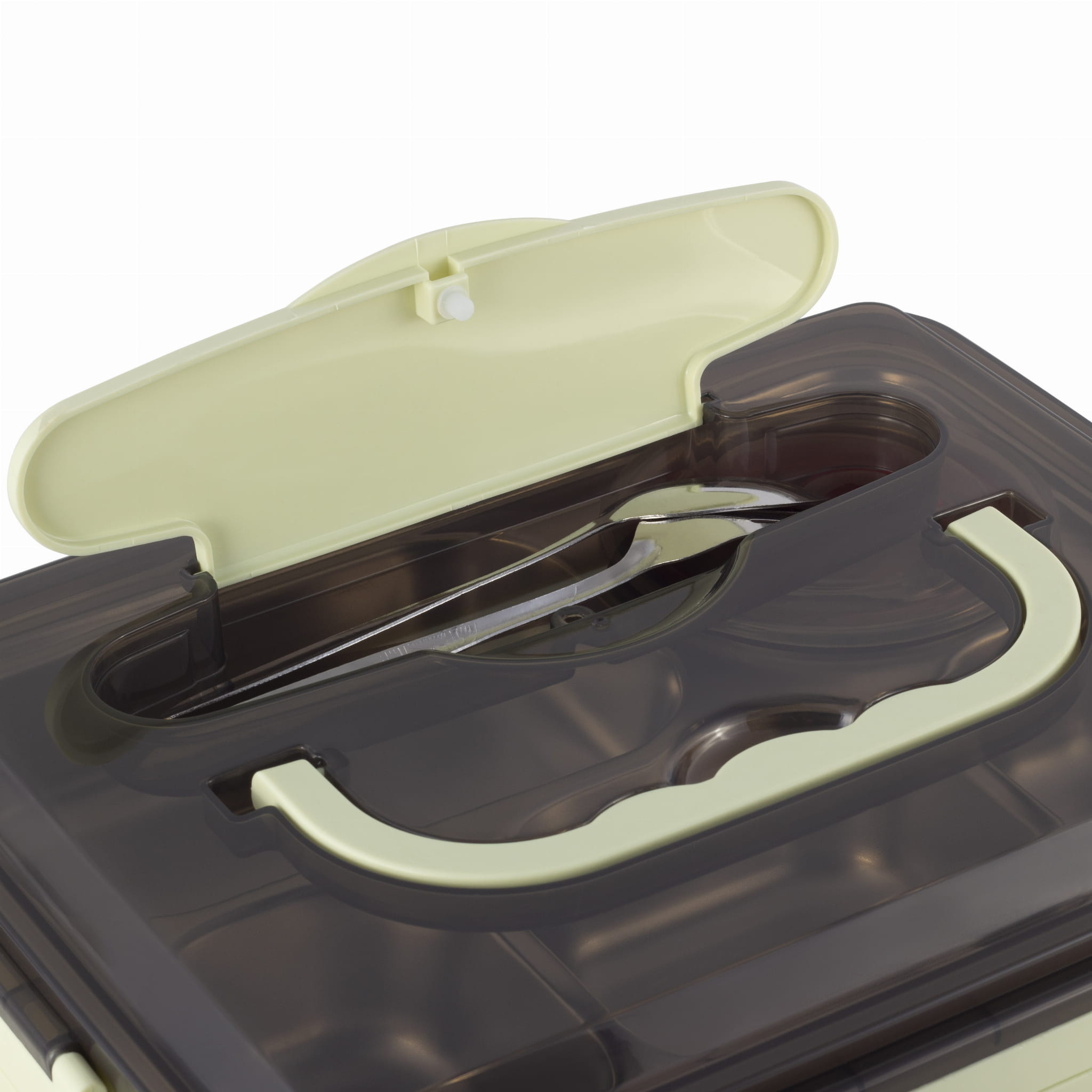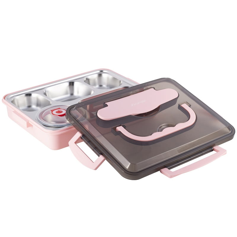 Dzięki 5 przegrodom na stalowej tacy, nie musisz martwić się wymieszaniem róznorodnych produktów i będziesz mieć pewność na odseparowanie ich od siebie. Dodatkowo w pojemniku znajduje się okrągły pojemniczek z pokrywką, który można wykorzystać np. do sosu.