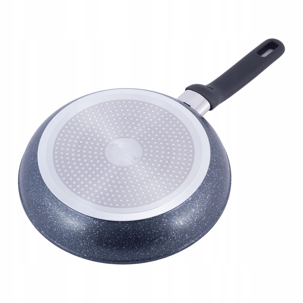 Wnętrze patelni pokryte jest trwałą powłoką marmurową non-stick, która ogranicza przywieranie potraw i pozwala smażyć z mniejszą ilością tłuszczu. Dzięki temu potrawy są łatwiejsze do przygotowania, a czyszczenie patelni zajmuje znacznie mniej czasu. Powłoka jest również odporna na zarysowania i wysoką temperaturę, co zwiększa trwałość naczynia podczas codziennego użytkowania.