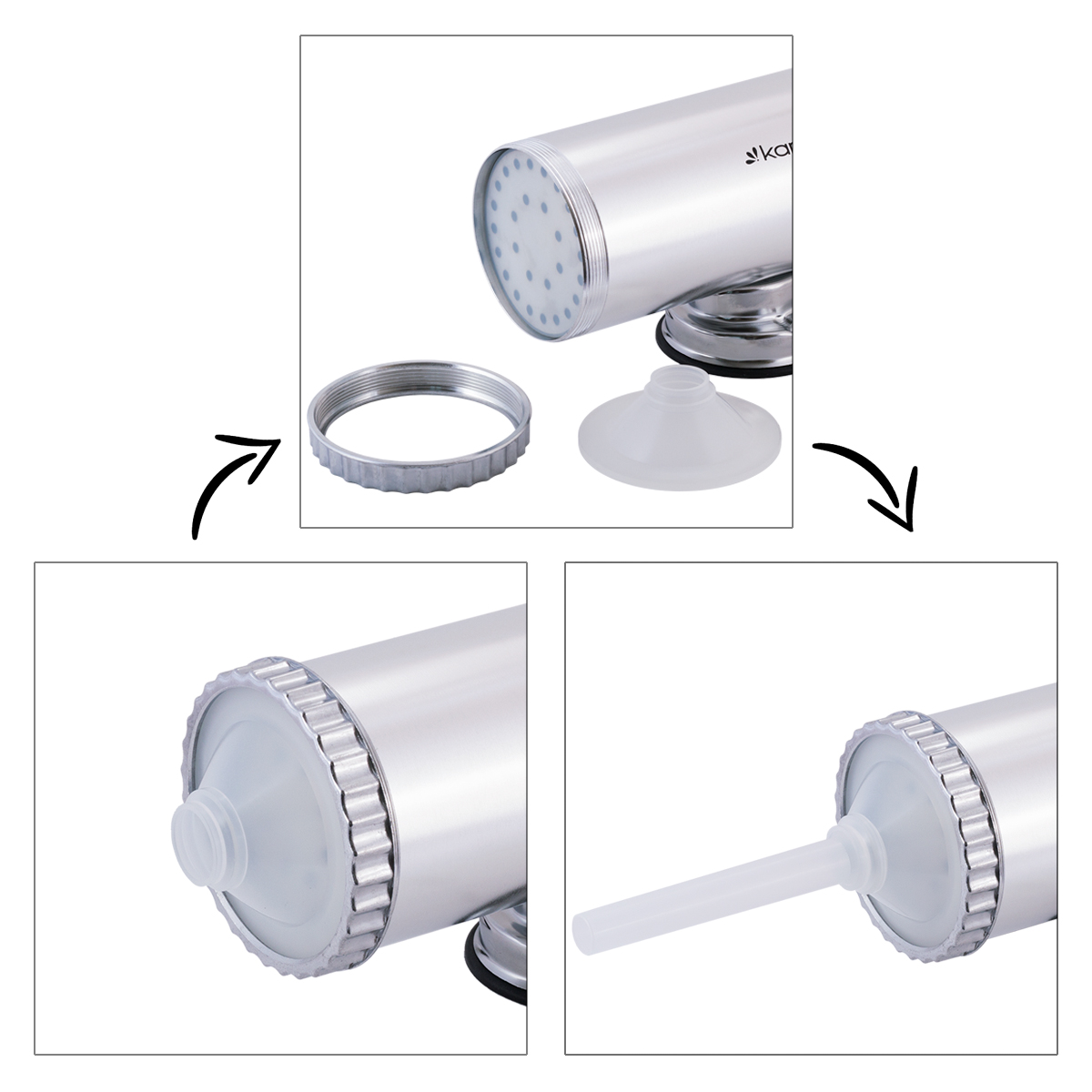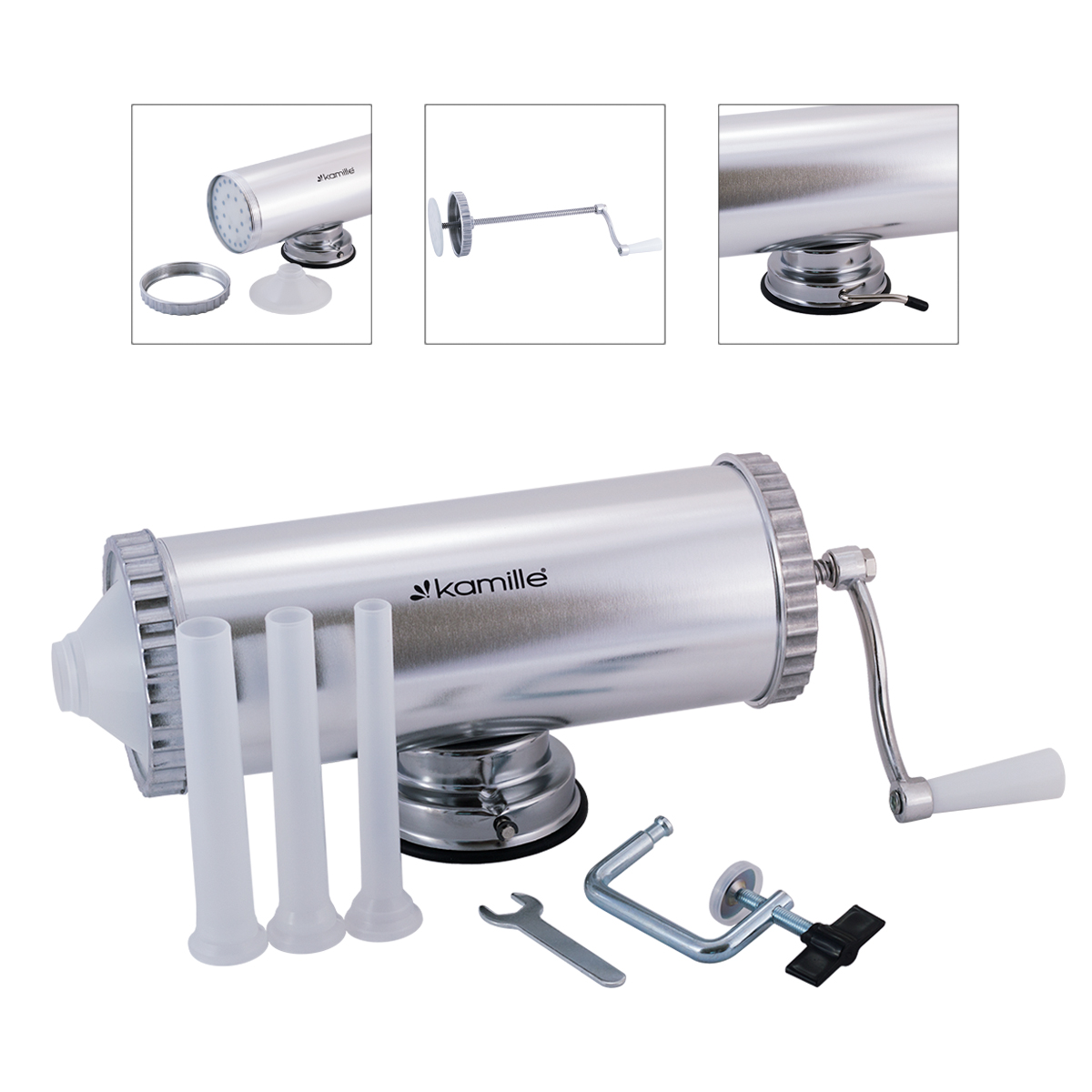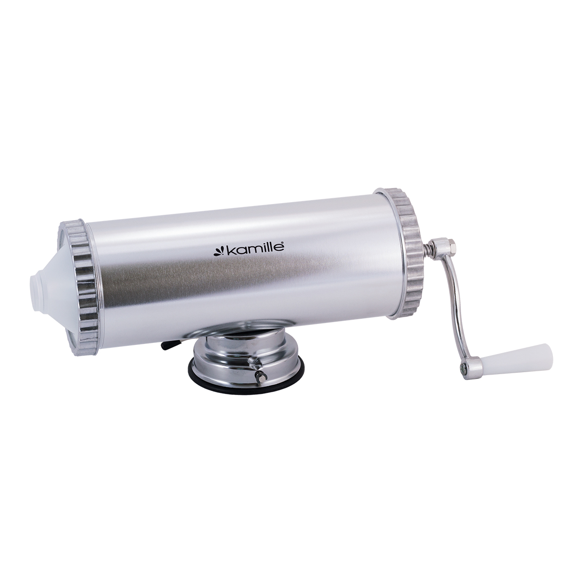 Ręczna nadziewarka do kiełbas Kamille o wielkości wsadu mięsnego 2,5 kg jest idealnym urządzeniem do napełniania farszem osłonek przy wyrobie wędlin, kiełbas i podobnych produktów. Nadziewarka umożliwia produkcję szerokiego asortymentu kiełbas, od kabanosów i parówek do klasycznych kiełbas oraz salami w zależności od wielkości lejka użytego do napełniania. Nadziewarka wykonana jest z aluminium, posiada przyssawkę i uchwyt do przykręcenia do blatu. Specjalna konstrukcja nadziewarki pozwala na jej łatwe rozbieranie, dzięki czemu utrzymanie w należytej czystości nie stanowi żadnego problemu.