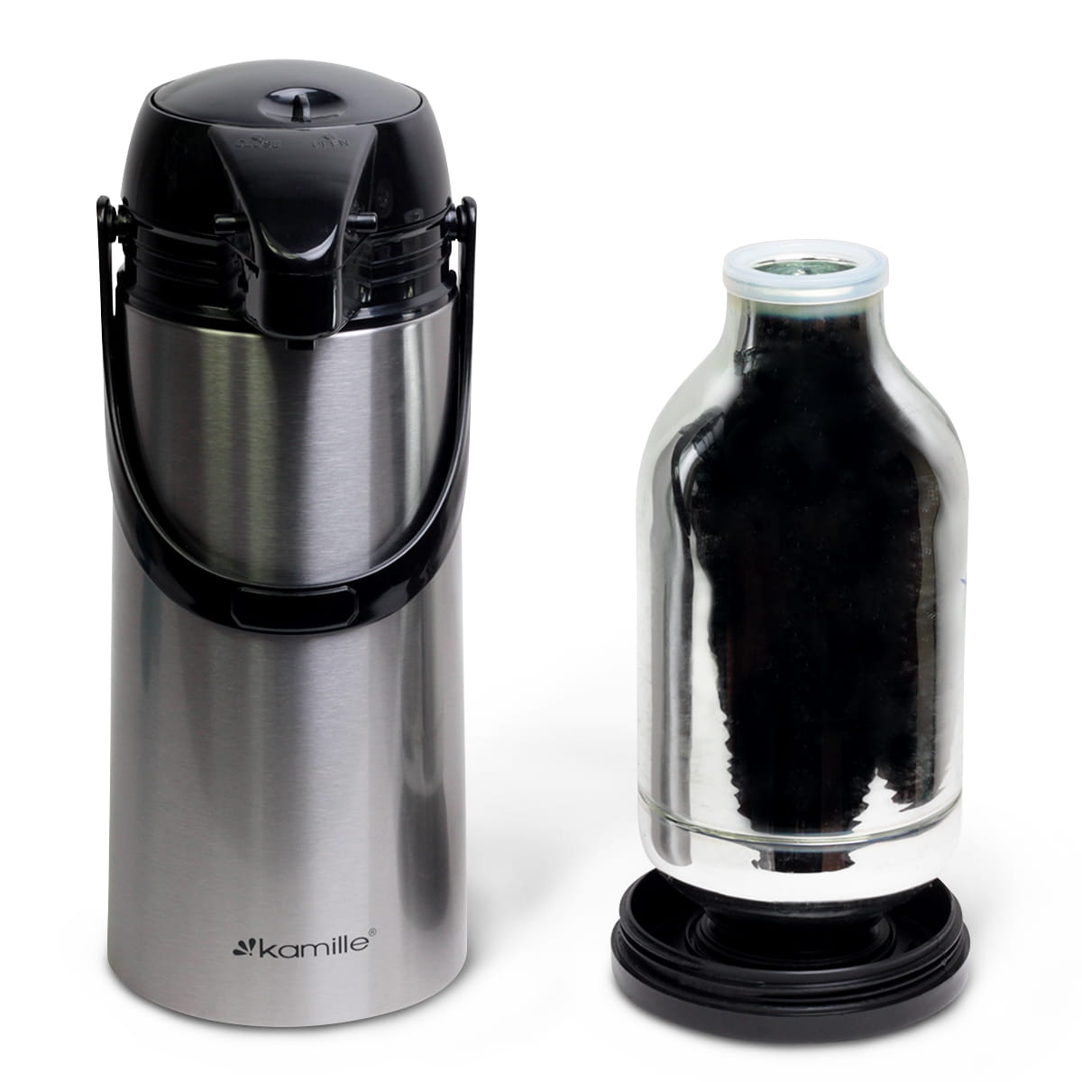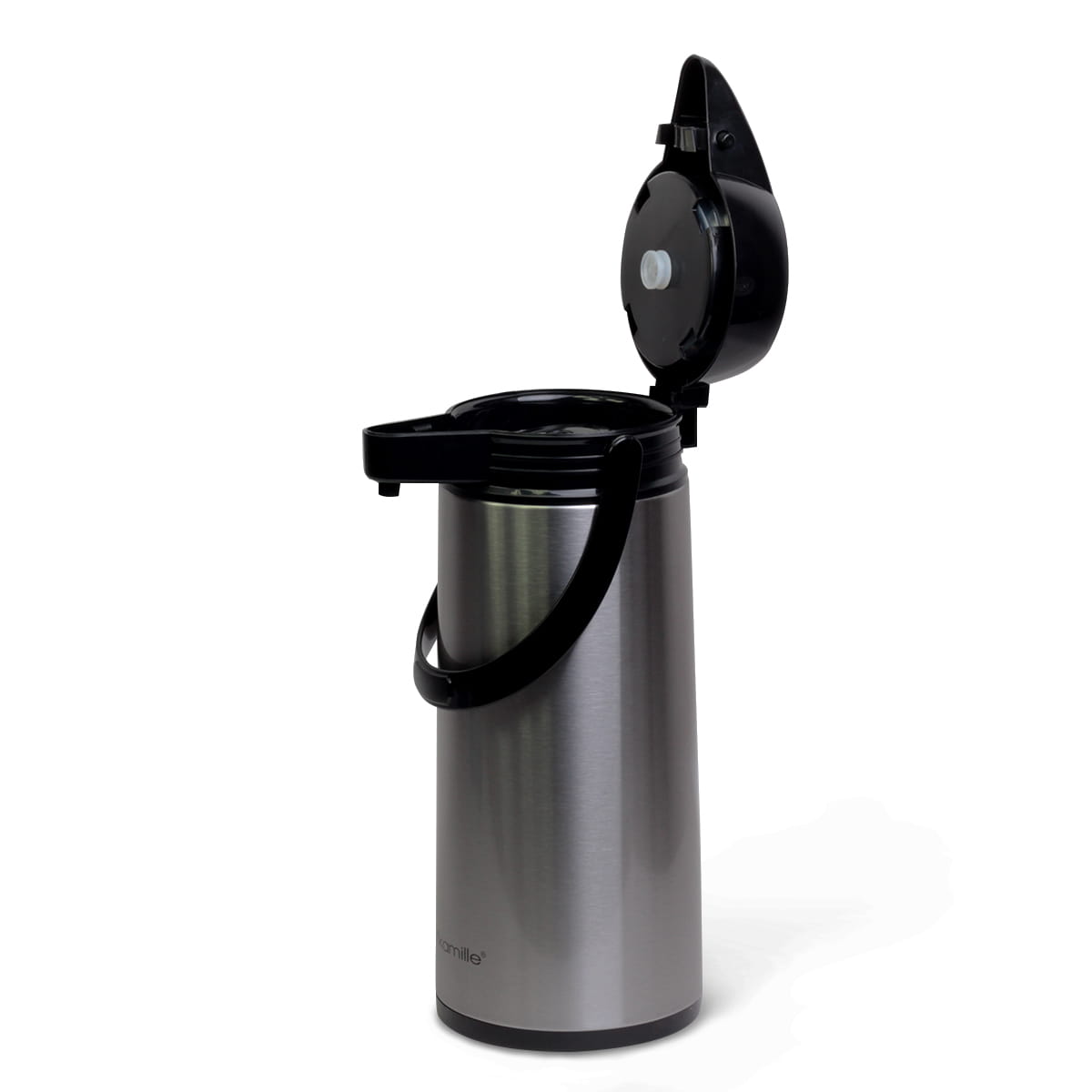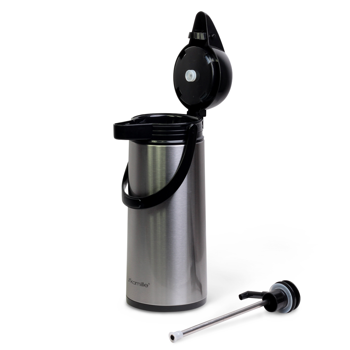 Termos konferencyjny Kamille 1,9 L z pompką to praktyczny pojemnik do serwowania kawy, herbaty i innych napojów podczas spotkań, konferencji czy w biurze. Dzięki dużej pojemności pozwala przygotować kilka porcji napoju i wygodnie nalewać je bez podnoszenia termosu.