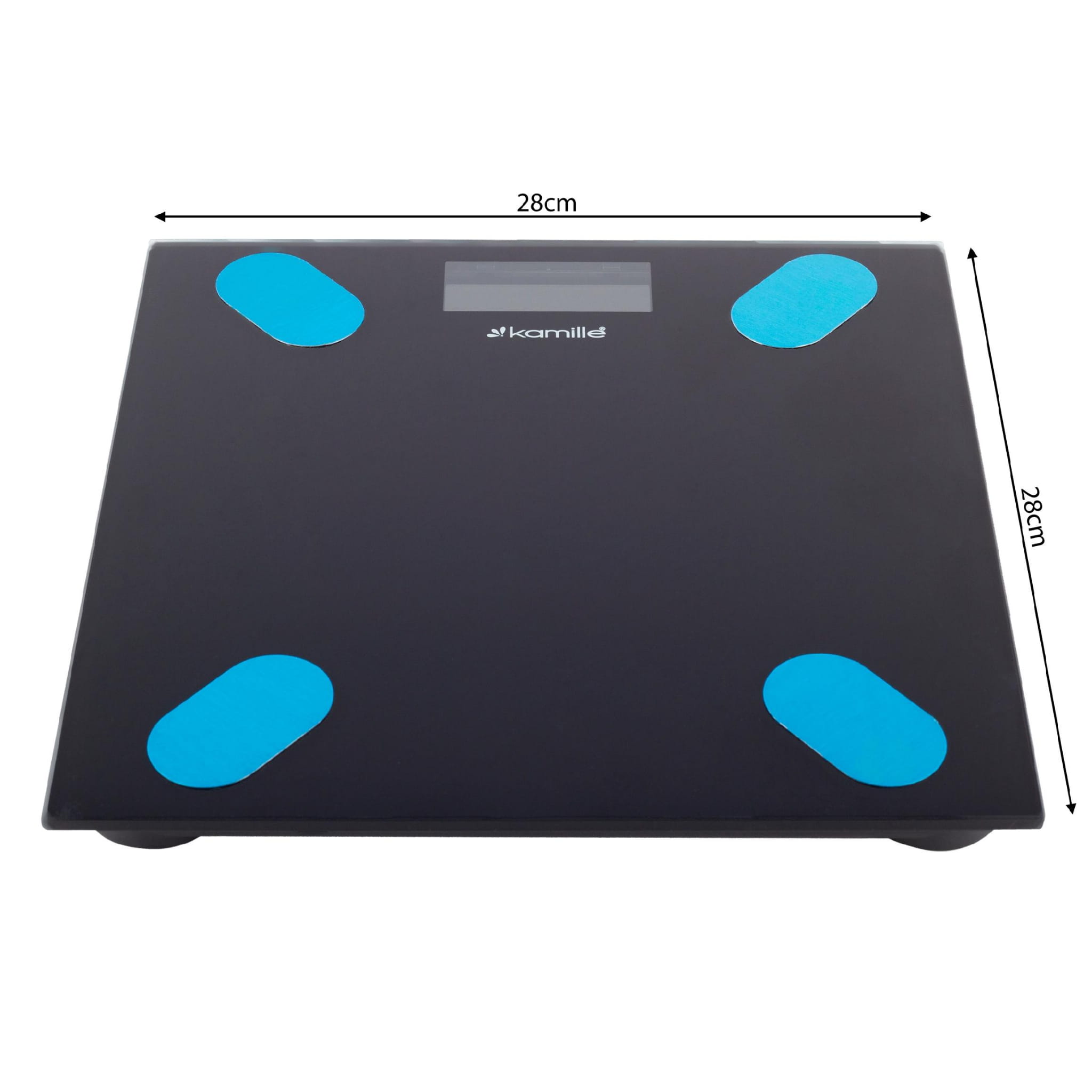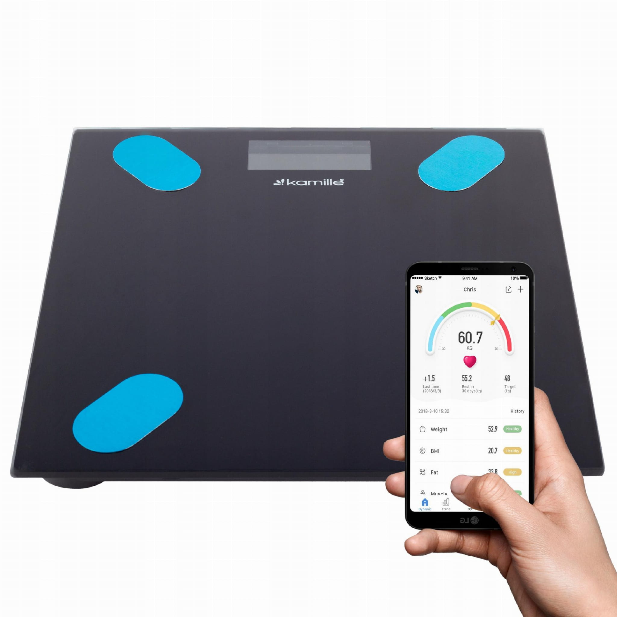 Waga łazienkowa Kamille to inteligenta waga klasy PREMIUM. Dzięki bezpłatnej aplikacji na telefon i połączeniu z wagą przez BLUETOOTH możesz śledzić wiele parametrów dotyczących swojego ciała i posiadać wszystkie statystyki zawsze pod ręką! Funkcja automatycznego włączania oraz wyłączania pozwala na oszczędność baterii, a szklana powłoka gwarantuje łatwe utrzymanie czystości. Waga łazienkowa została wykonana z wysokiej jakości materiałów. Hartowane szkło o grubości 4 mm pozwala na pomiar wagi aż do 180kg. Waga posiada antypoślizgowe podkładki, czytelny ekran LCD pozwalający na odczyt wyników pomiarów, temperatury otoczenia oraz stan naładowania baterii.