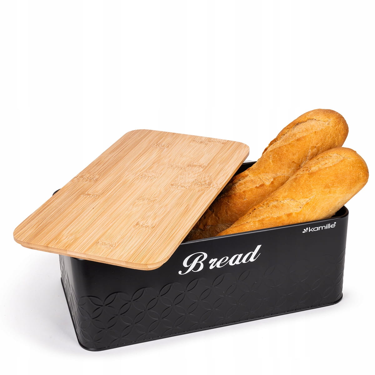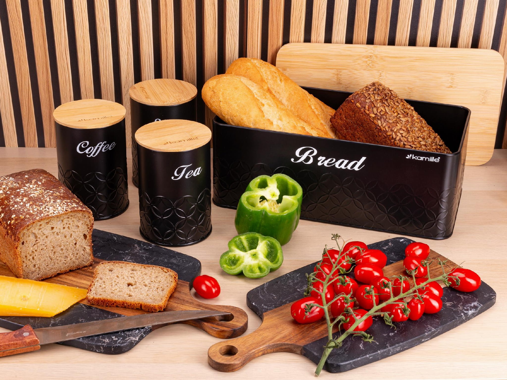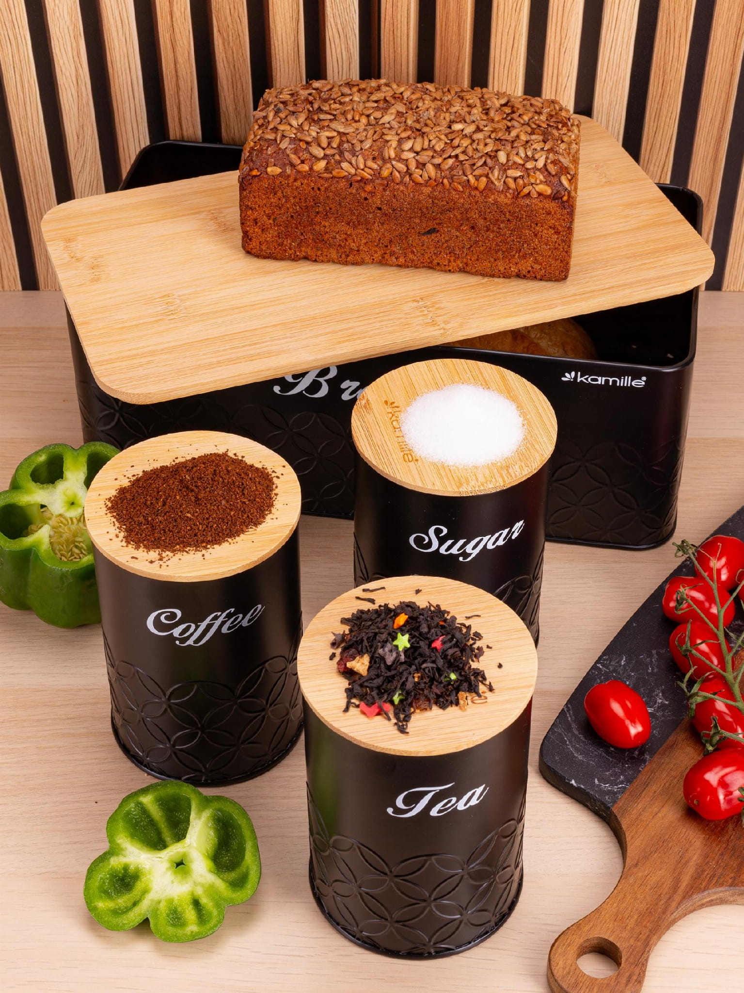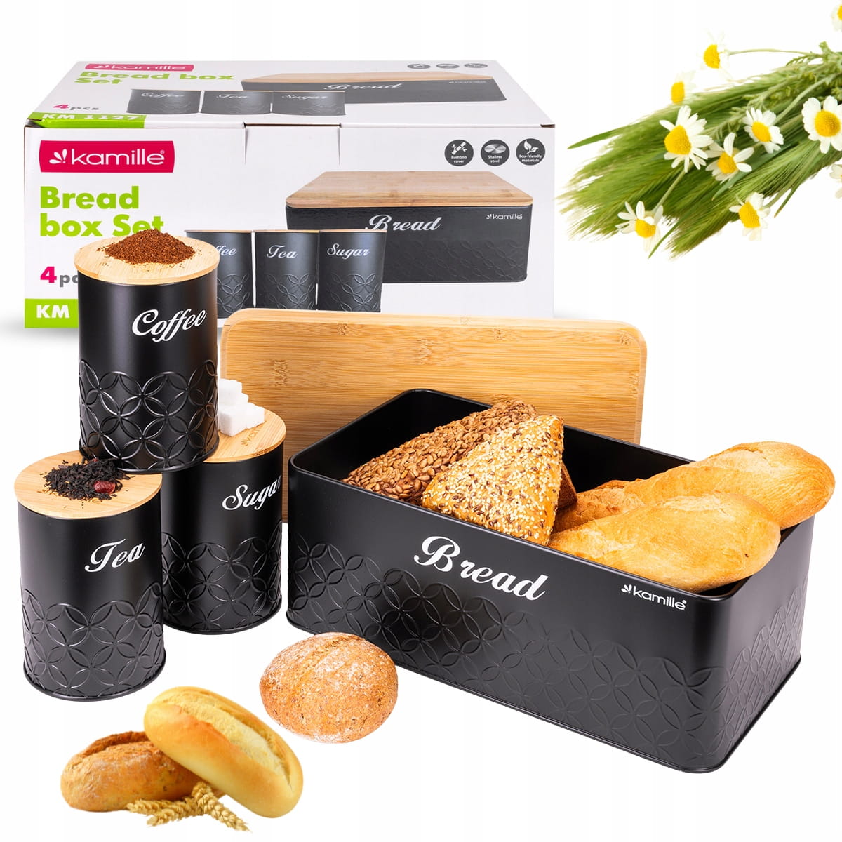 Stylowy i nowoczesny chlebak Kamille wraz 3 pojemnikami, które idealnie nadają się do przechowywania kawy, herbaty i cukru. Dzięki swojemu oryginalnemu designowi, pojemniki staną się ciekawym elementem dekoracyjnym kuchni. Chlebak i pojemniki wykonane są ze stali nierdzewnej malowanej na czarny kolor oraz drewna bambusowego. Zastosowane materiały są nie tylko najlepsze z możliwych, ale także świetnie się prezentują i są wyjątkowo łatwe w czyszczeniu. Pokrywę można wykorzystać jako deskę do krojenia chleba.