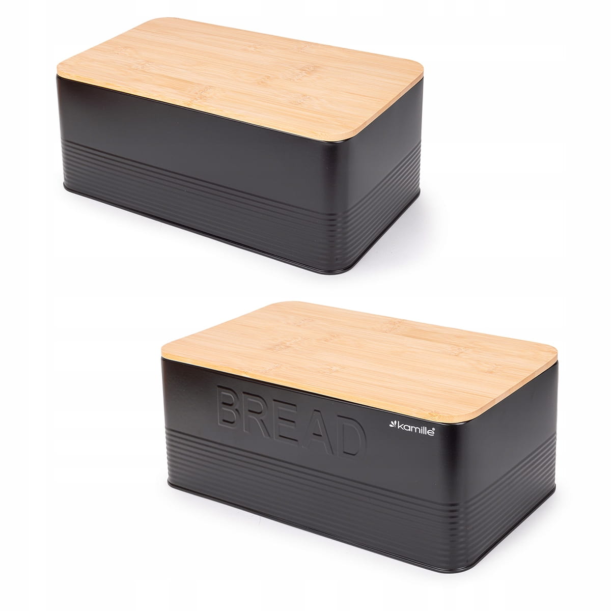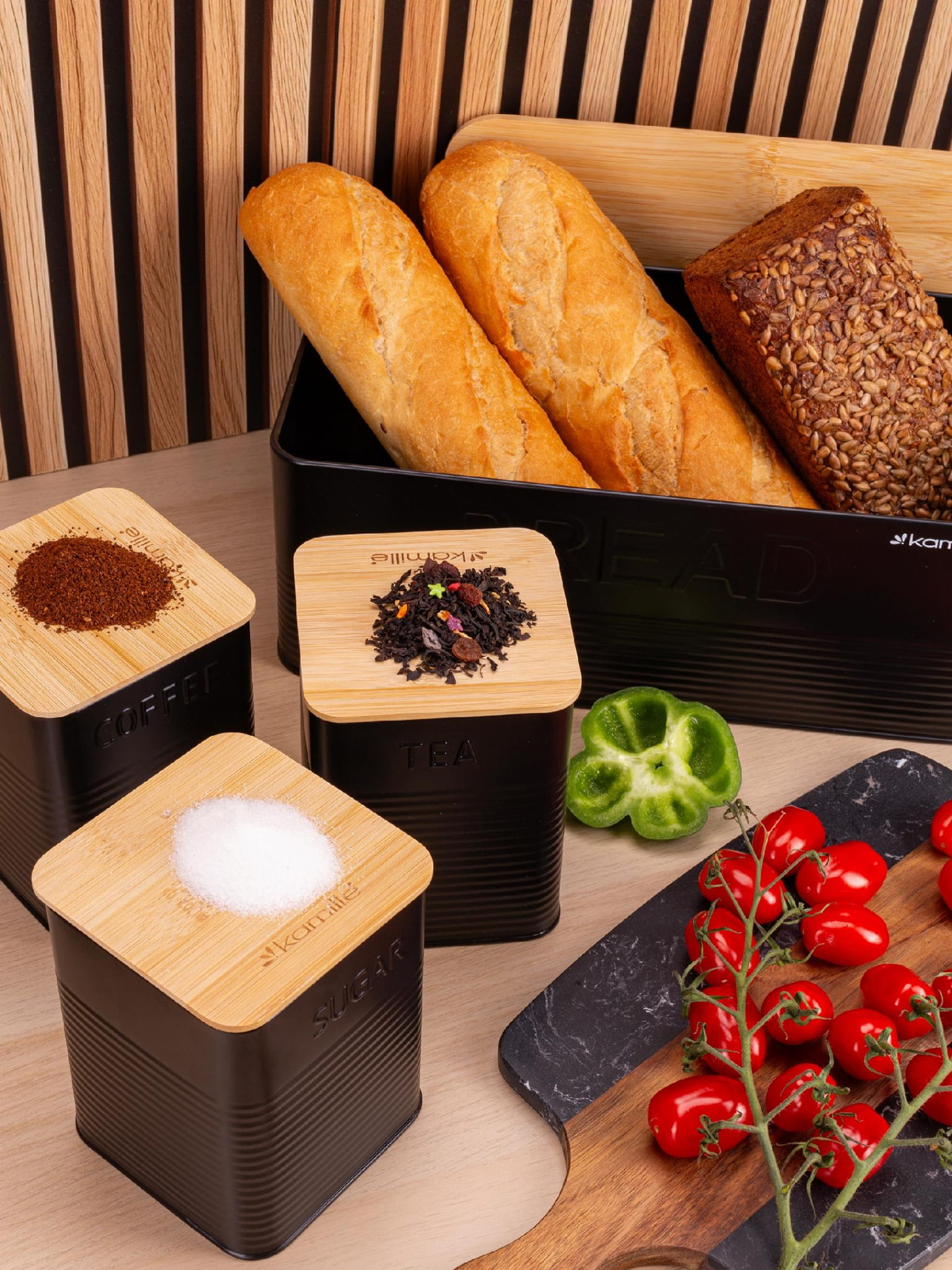 - chlebak i pojemniki wykonane ze stali niedrzewnej malowanej na czarny kolor oraz drewna bambusowego