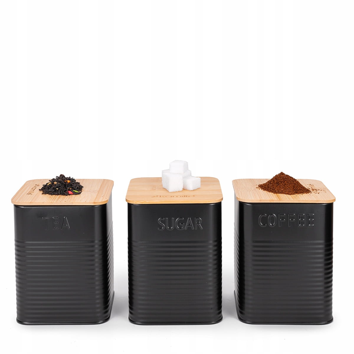 - w zestawie 3 pojemniki do przechowywania kawy, herbaty i cukru
