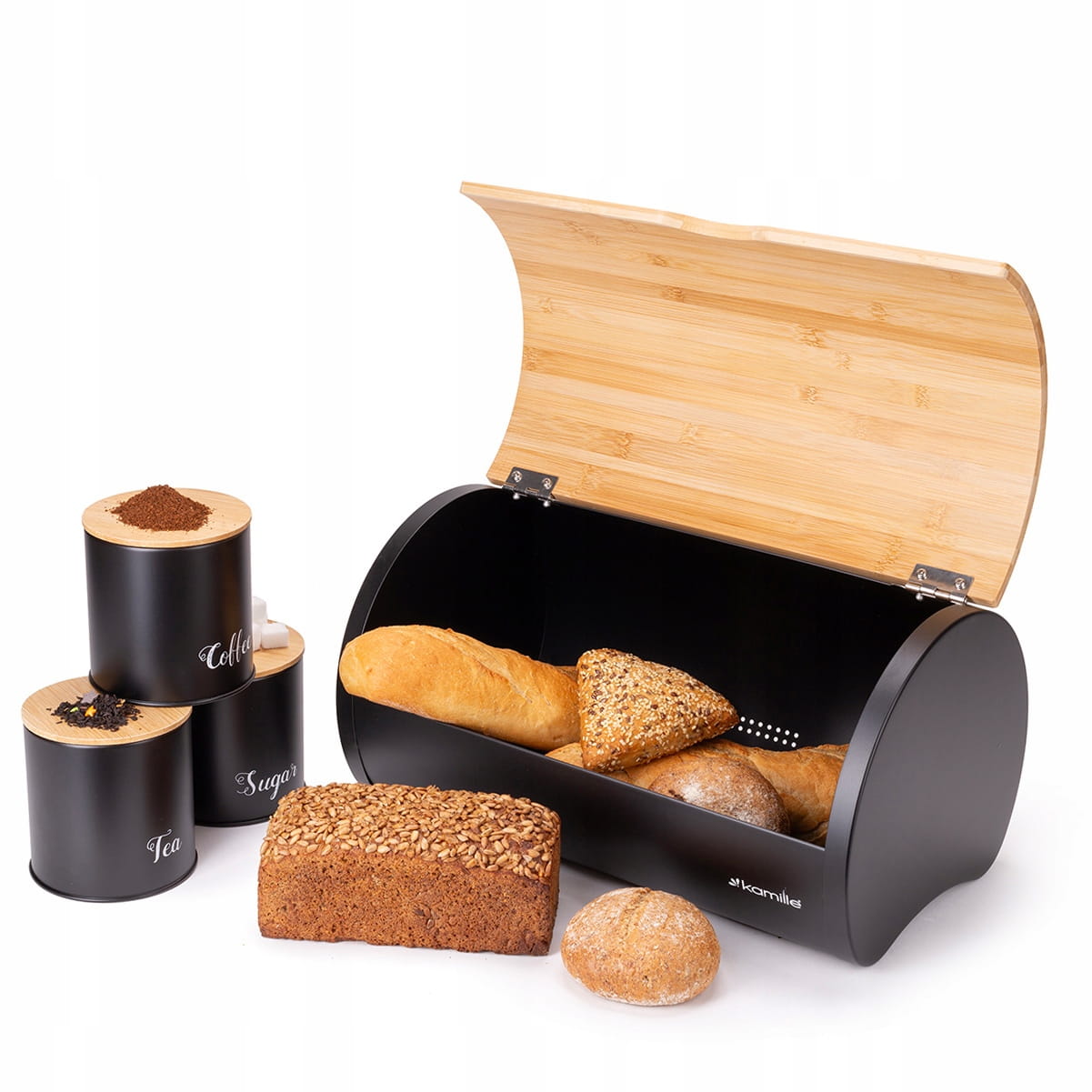 Chlebak i pojemniki wykonane są ze stali nierdzewnej malowanej na czarny kolor oraz drewna bambusowego. Zastosowane materiały są nie tylko najlepsze z możliwych, ale także świetnie się prezentują i są wyjątkowo łatwe w czyszczeniu. Pokrywę można wykorzystać jako deskę do krojenia chleba.
