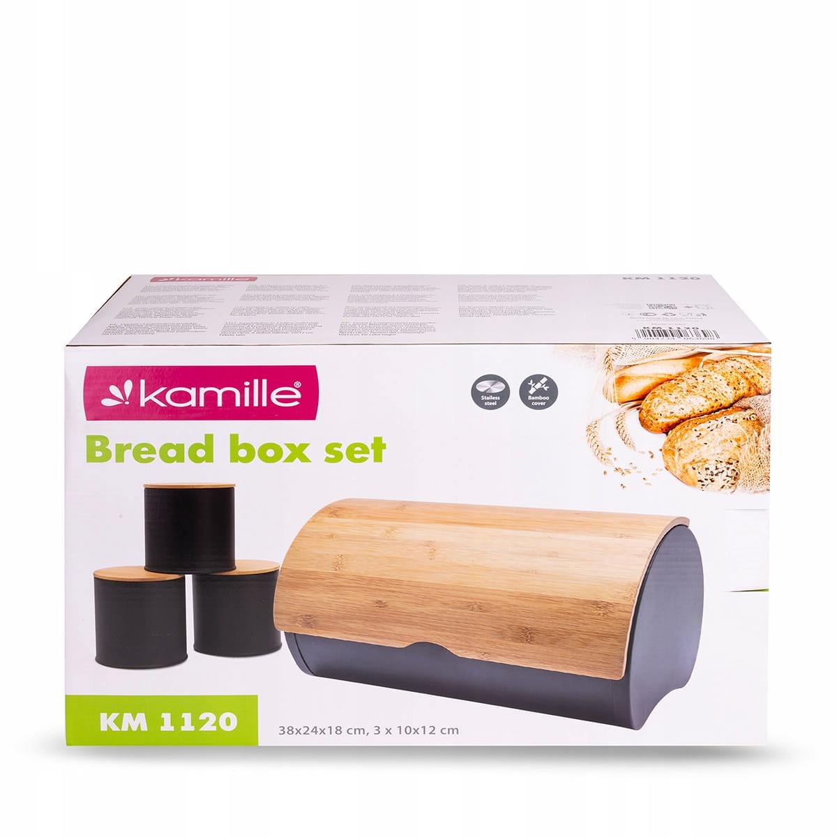 Stylowy i nowoczesny chlebak Kamille wraz 3 pojemnikami, które idealnie nadają się do przechowywania kawy, herbaty i cukru. Dzięki swojemu oryginalnemu designowi, pojemniki staną się ciekawym elementem dekoracyjnym kuchni.