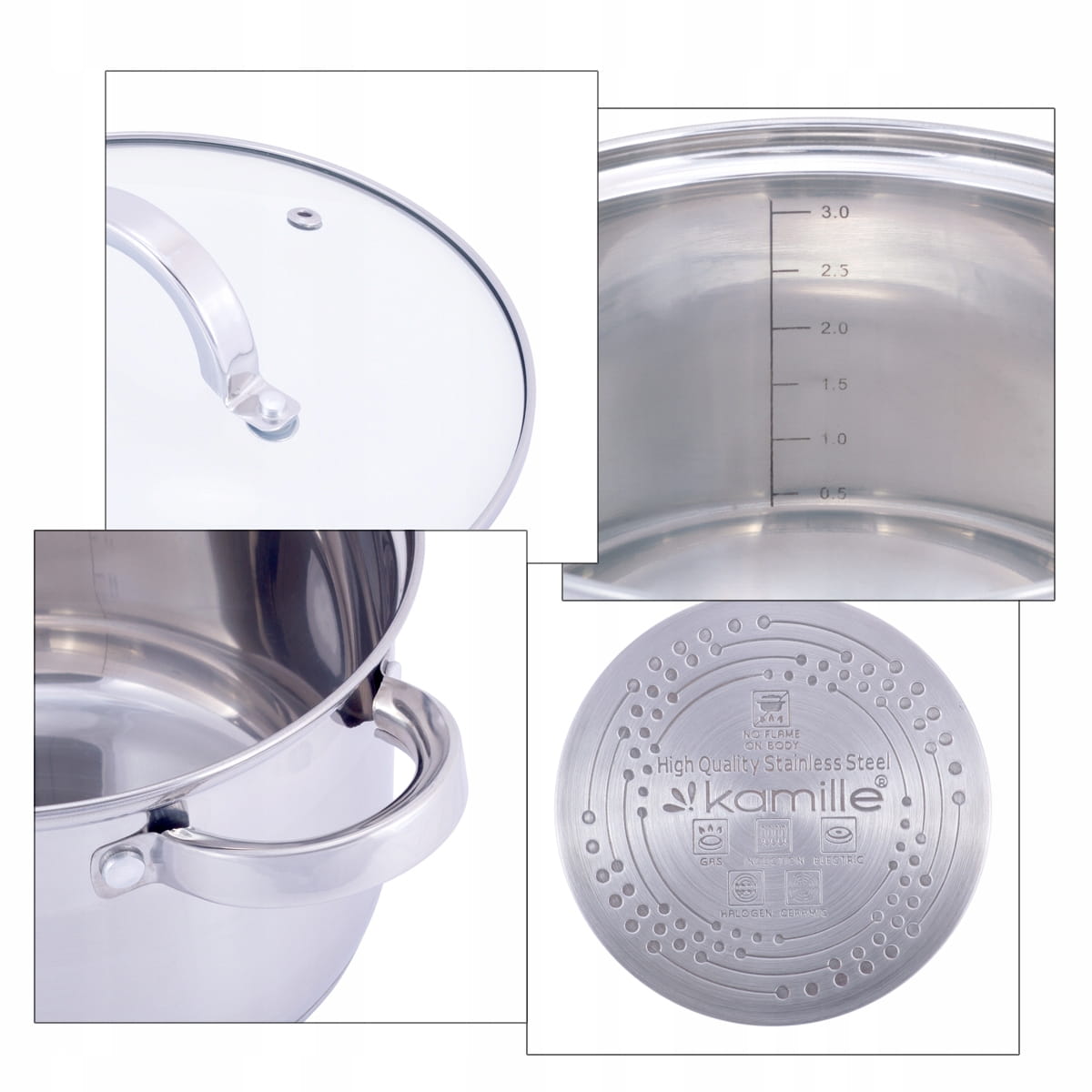 | Cechy | wykonane z wysokiej jakości stali nierdzewnej, 5-warstwowe indukcyjne dno, precyzyjna skala pojemności, odporne na temperatury pokrywki, przystosowane do wszystkich typów kuchenek |