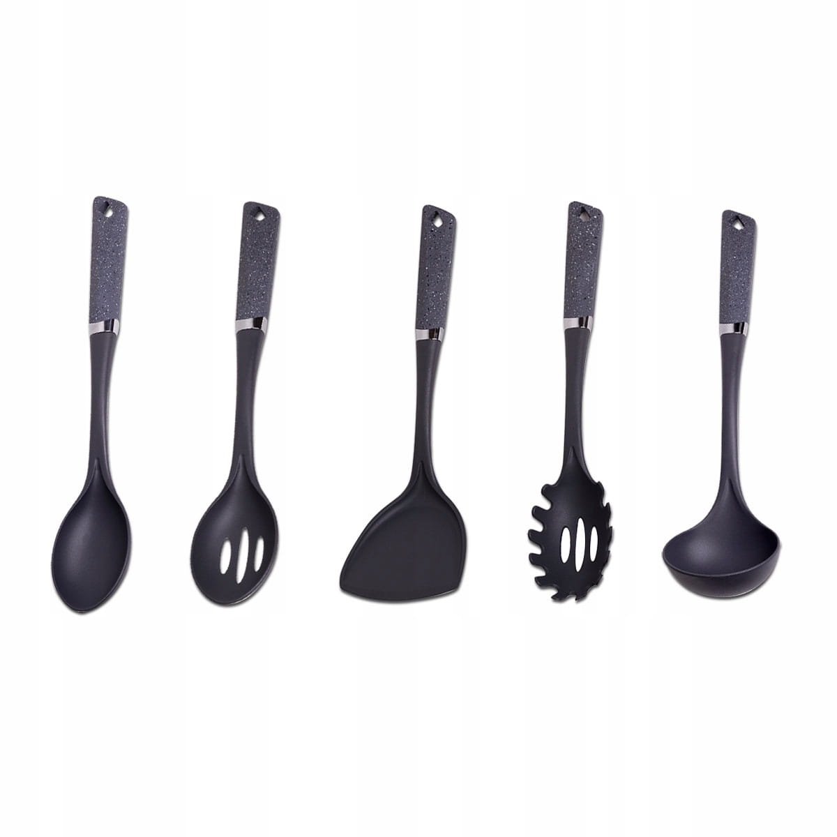 Funkcjonalny kształt rączek sprawia, że przybory pewnie i wygodnie trzyma się w dłoni. Wysokiej jakości tworzywo, z którego wykonane zostały sztućce jest odporne na wysokie temperatury. Przybory nie tworzą zarysowań na powierzchni naczyń. Stabilny stojak daje możliwość wygodnego korzystania z przyborów. Stojak posiada stabilną podstawę, która uniemożliwia wywrócenie się go wraz z wiszącymi przyborami. Uchwyt na górze stojaka, pozwala na swobodne przenoszenie. Elegancki ponadczasowy design, ergonomia połączona z wysoką jakością wykonania gwarantują długi okres użytkowania.