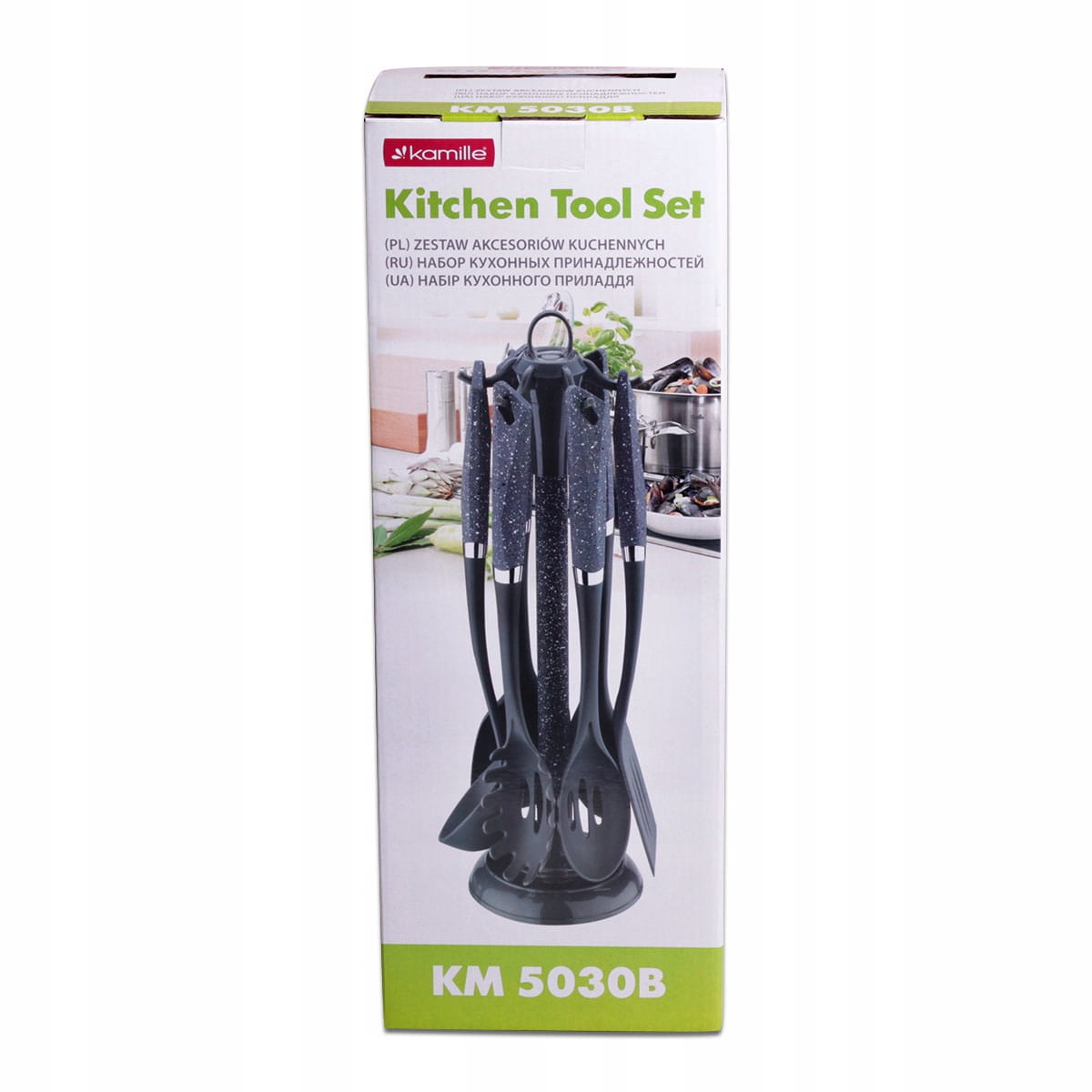 Akcesoria kuchenne Kamille wyróżniają się nowoczesnym kształtem i perfekcyjnym wykonaniem. Wykonane z wysokiej jakości trwałego tworzywa. Ten wysokiej klasy komplet sztućców na stojaku sprawi, że przygotowywanie wszelkiego rodzaju potraw, gotowanie i nalewanie zupy, ubijanie ziemniaków, czy precyzyjne nałożenie makaronu spaghetti, dzięki nim stanie się łatwiejsze i wygodniejsze.